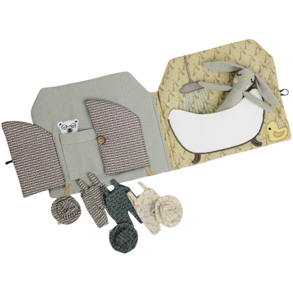 Introducing the Smallstuff Bathroom Tiny House Book, an enchanting soft activity book featuring a delightful rabbit character. This toy comes with three pairs of adorable overalls and matching hats, all made from 100% cotton with PET filling from recycled plastic bottles. Measuring 22x21 cm, it's designed for children aged 3 and older. Safety and comfort are assured as it meets the OEKO-TEX Standard 100. Ideal for traveling, dining out, or peaceful time at home, it is easily washable at 30 degrees on a gentle cycle, ensuring durability and ease of maintenance. Engage your little one's imagination and aid their learning with this portable and educational companion.