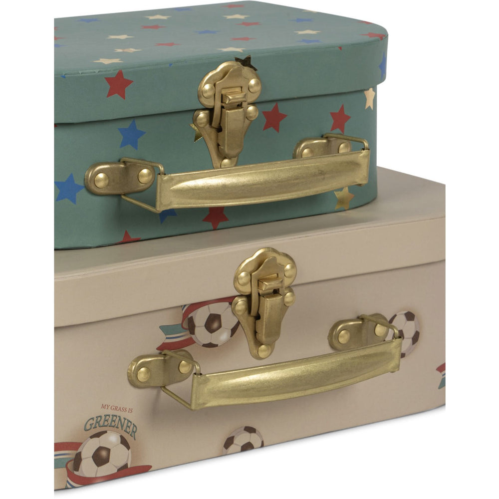 Discover the charm of the Konges Sløjd Off White/Kick It 2 Pack Suitcase FSC! These delightful play suitcases, crafted from robust cardboard and adorned with a sturdy metal handle, promise both safety and durability. Ideal for young explorers, the set includes a large and a smaller suitcase, where the latter neatly tucks into the former, optimizing storage. Their engaging design not only beautifies any child's room but also invites creativity and organizational skills, making them wonderful for storing those little treasures. Materials: Cardboard Handles Metal Certifications: FSC MIX CREDIT