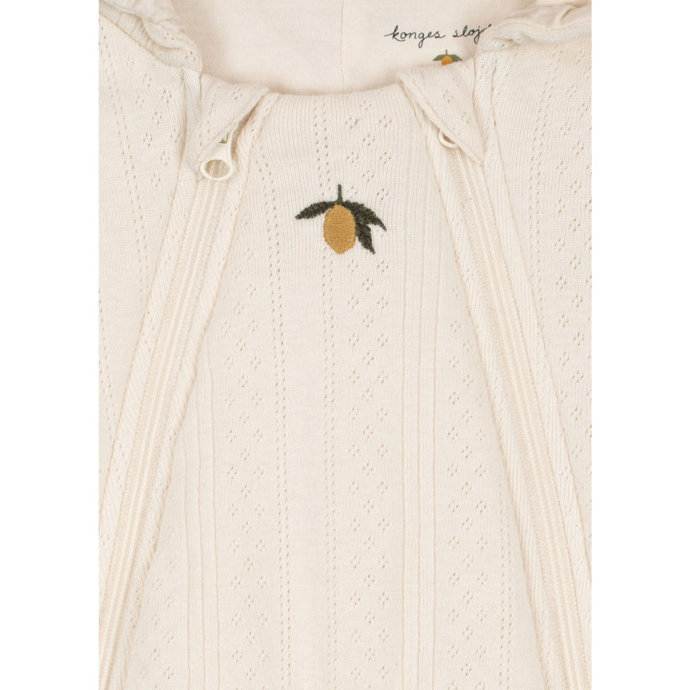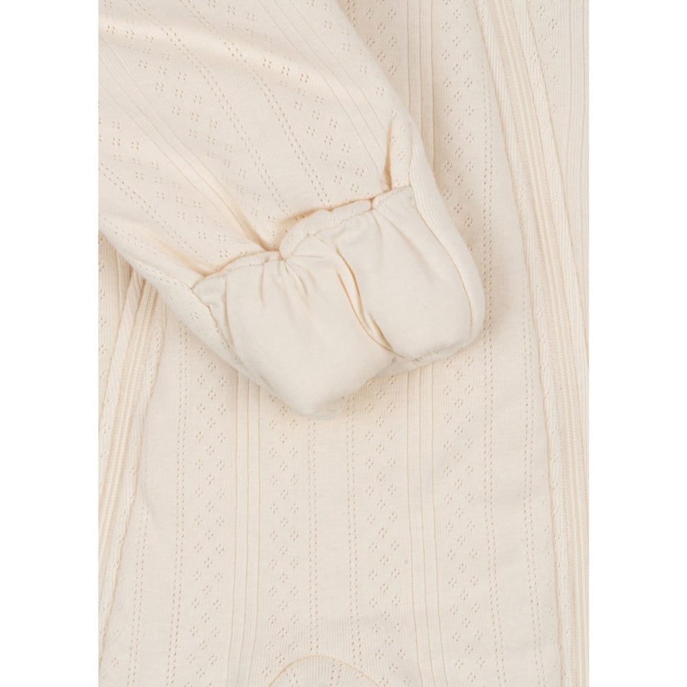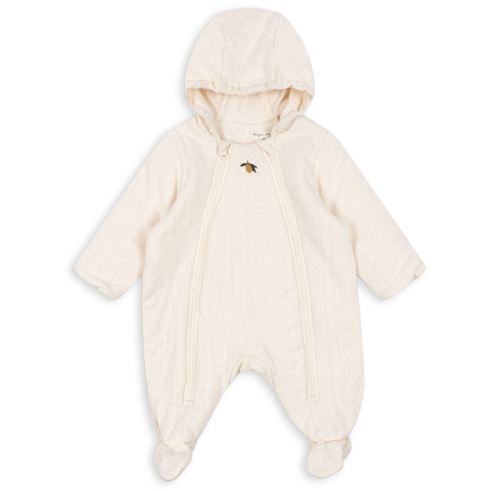 Introducing the Konges Sløjd Antique White Minna Padded Onesie for your little one! Crafted from 100% cotton with polyester padding, this cozy stroller suit features a charming pointelle design, complete with a hoodie and foot covers for full warmth. Dual front zippers ensure easy dressing, while OEKO-TEX® STANDARD 100 certification promises safe and gentle contact with your baby's skin. Perfect for chilly days, this onesie combines style, comfort, and practical functionality.