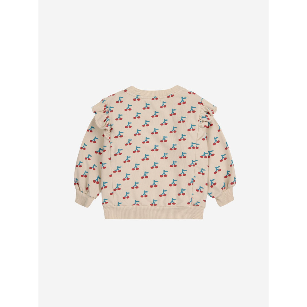 Bobo Choses White Cherry All Over Ruffle Crewneck - 9 m is backordered and will ship as soon as it is back in stock.