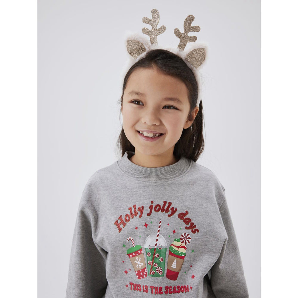 Introducing the Name It Grey Melange Ruljul Regular Sweatshirt, the perfect addition to your child's holiday wardrobe. Crafted from soft brushed sweat fabric, this cozy sweatshirt ensures a comfortable feel while your child celebrates the festive season. Featuring a classic round neck and long sleeves with snug ribbed cuffs, this piece combines comfort with style.