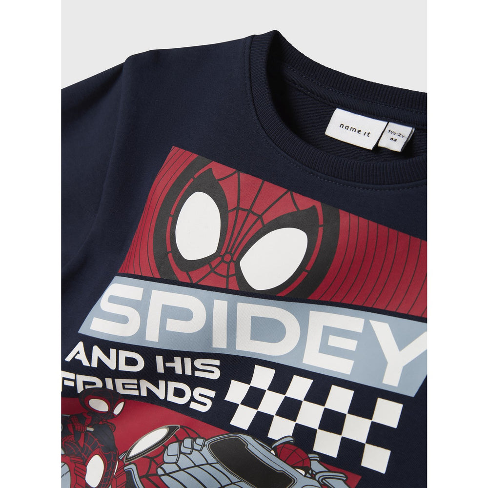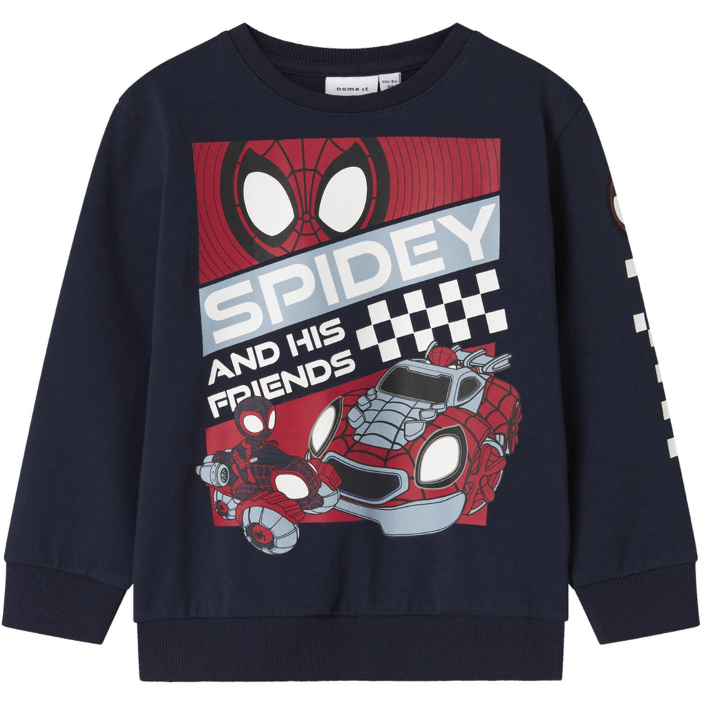 Introduce a dash of superhero flair to your little one's collection with the Name It Navy Blazer Nmmjo Spider Nreg Sweat Unb. Crafted from smooth, unbrushed sweat fabric, this sweatshirt features a cozy inner looping that ensures supreme comfort. Embellished with a vibrant Spider-Man inspired rubber print that feels soft to the touch, it's perfect for young fans of the iconic web-slinger.
