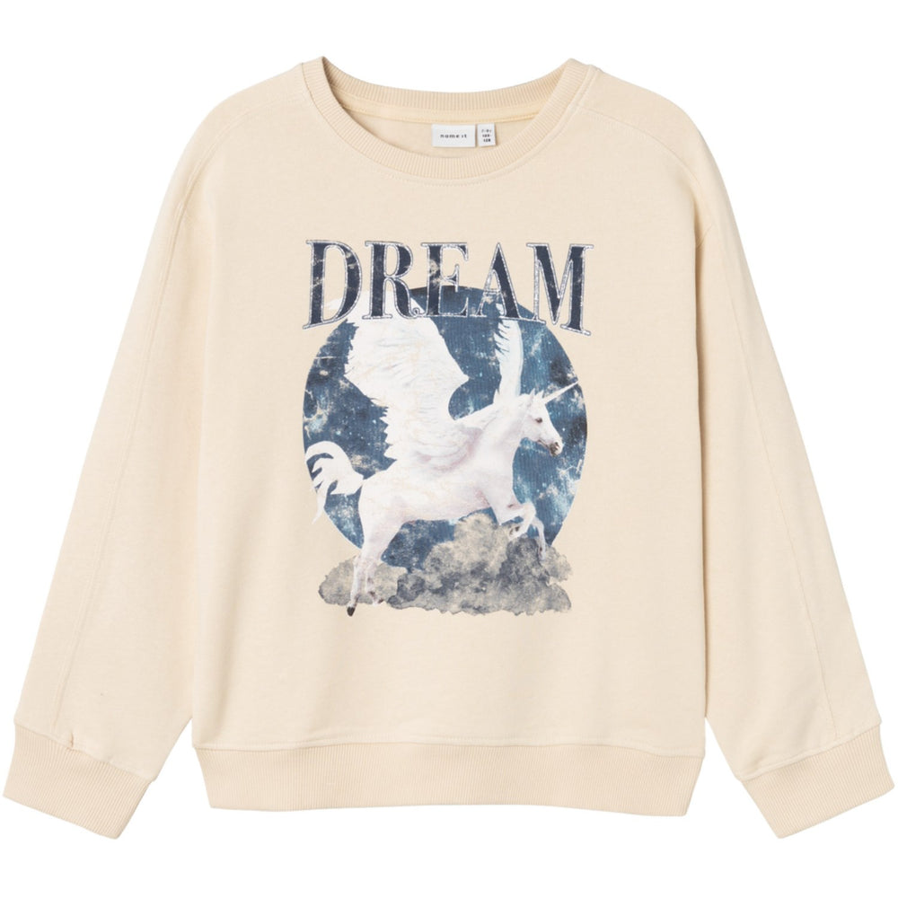 Introducing the Name It Summer Sand Oldet Sweatshirt - the ideal addition to your little one's wardrobe for both comfort and style. Crafted from brushed sweat fabric, this sweatshirt features a soft interior that ensures a snug feeling any child would love. It showcases a realistic and detailed photo print that adds a splash of fun to their everyday outfits. This sweatshirt comes with a classic round neck and long raglan sleeves that enhance mobility, making it perfect for playful kids. The ribbed cuffs add a touch of elegance while ensuring a good fit. Designed with a relaxed fit, it offers ample room for movement, crucial for growing children. Available in a soothing color and intriguing pattern, the Summer Sand Oldet Sweatshirt stands up to frequent wear, thanks to its durable material. Easy to care for, it retains its shape and feel even after multiple washes, ensuring that your child looks and feels great every time they wear it. Ideal for a variety of activities, this sweatshirt keeps your child warm, comfortable, and stylish through all their adventures.