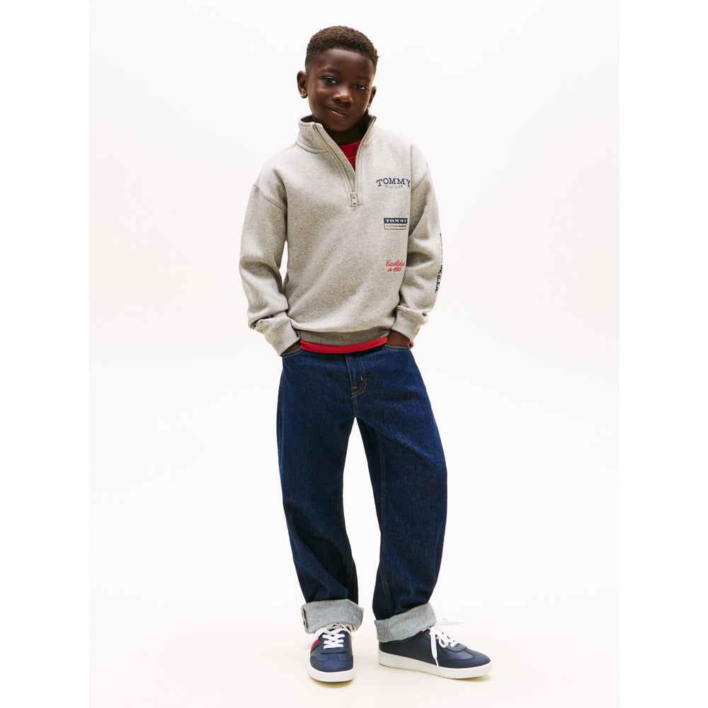 Discover cozy chic for your little one with the Tommy Hilfiger Mid Grey Heather Multi Print Half Zip Sweatshirt. Crafted from soft, breathable material, this sweatshirt features a stylish half-zip design adorned with a playful multi-color print. Ideal for versatile layering, its snug fit and easy-care fabric ensure comfort and durability for all-day play. Perfect for both school and weekend outings, it adds a dash of fun to any child's wardrobe! Materials: Regenerative Cotton (80%), Recycled Polyester (20%)