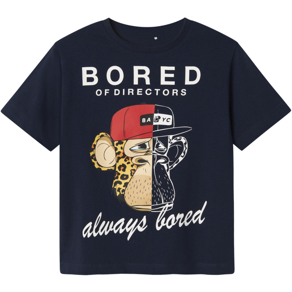 This unique tee comes in a vibrant navy shade enhanced by a playful "Bored of Directors" rubber print, ensuring a gentle feel against the skin while adding a touch of whimsy. Designed for optimal movement, our round neck, short-sleeved top features a standard fit, making it ideal for active kids.