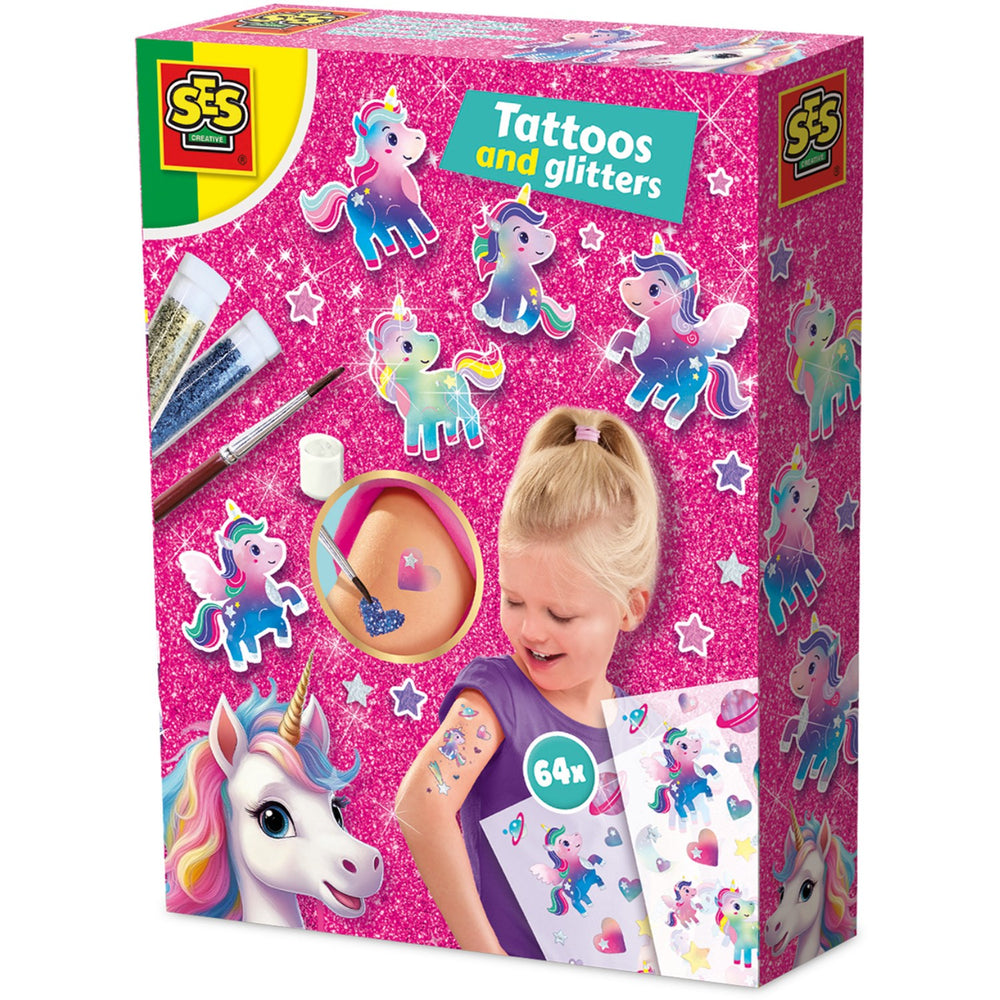 Give your kids a magical and creative play experience with SES Creative Tattoos and Glitter Unicorn. This set lets kids design their own colorful tattoos, complete with sparkling glitter, perfect for little artists between the ages of 5 and 9. These safe and easy-to-use tattoos that have been cosmetically tested are ideal for both fun and partying. The metallic stick-on tattoos shine beautifully, while glitter and special glue add an extra touch of festivity. The pack includes unicorn-motivated tattoos and two colors of glitter that can be easily applied and removed without any hassle. Explore the creative potential of your kids with this entertaining and educational set. With dimensions of 15 x 20 x 4 cm, the set is also easy to store and transport, making it a perfect activity for both home and on the go.