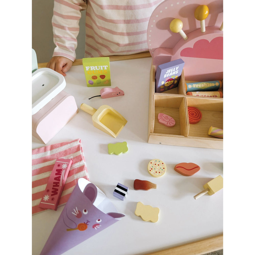 Delight little sweet shop managers with the Tender Leaf Slikbutik, a charming and colorful wooden candy store playset that sets the stage for imaginative play and classic fun. Perfect for children aged 3-5 years, this kid-friendly set includes a variety of mock confections such as wine gums, lollipops, and chocolates, all stored in easily accessible compartments.