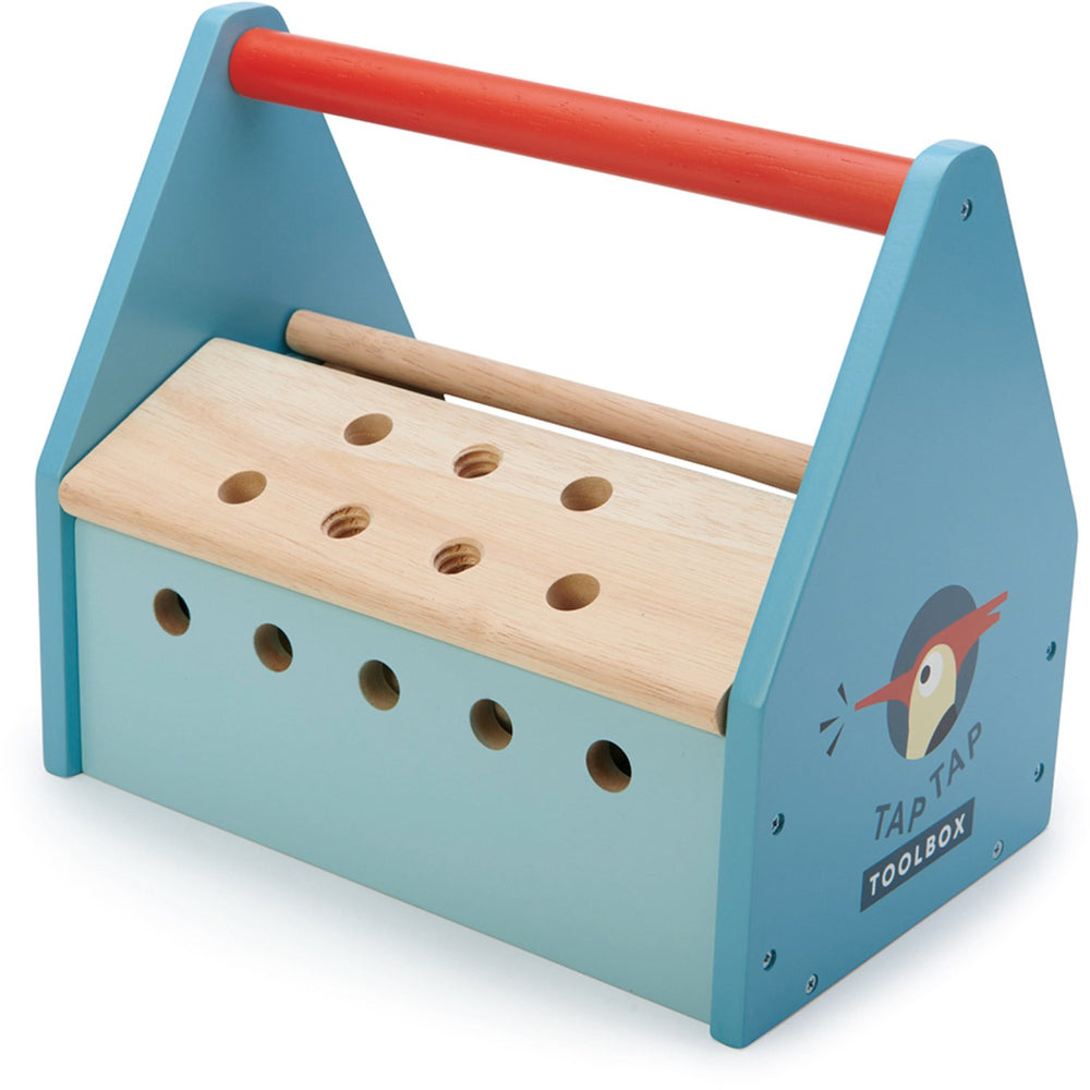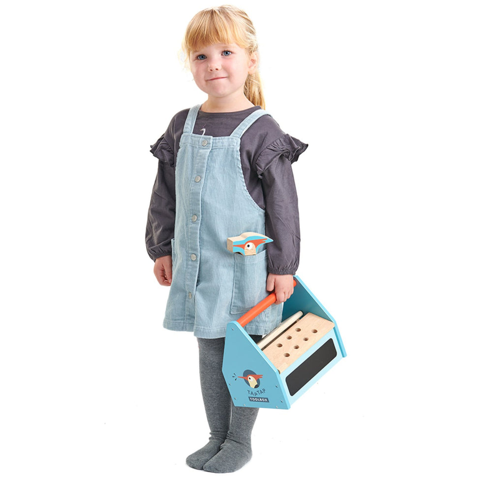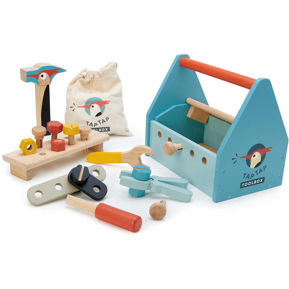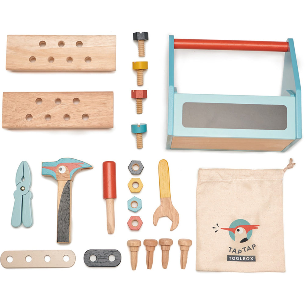 Delight your budding builder with the Tender Leaf Toolbox, a complete set of wooden tools designed for imaginative play and skill development. This charming toolbox encourages safety, with all items made of smooth, child-friendly wood. It's a treasure trove for little hands, featuring a versatile toolset including a woodpecker hammer, pliers, and more, all tailored for easy use by children. The innovative design includes a writable board for jotting down creative ideas and removable lids that transform into workable plates for realistic building play. Ideal for kids who love to tinker, this toolbox not only helps in honing fine motor skills but also fosters learning through interactive engagement. Compact and easy to store, all pieces neatly pack away into the included fabric bag, making cleanup a breeze and portability simple. Perfect for children eager to explore and create, the Tender Leaf Toolbox is an excellent addition to any playroom.
