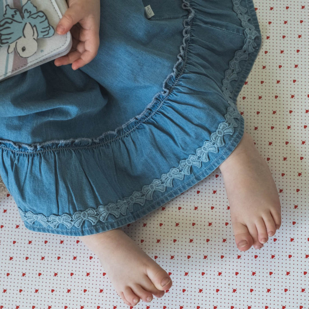 Introducing the delightful 'That's Mine Blue Jasmin Dress' – perfect for your little one's wardrobe! This beautiful chambray dress hits just at the knee, blending classic style with playful details. It features an elastic smock at the back, ensuring an easy, fuss-free dressing experience. The charming flounces at the sleeves, coupled with contrast-colored thread at the flounce and skirt edges, add a touch of whimsy and unique appeal.