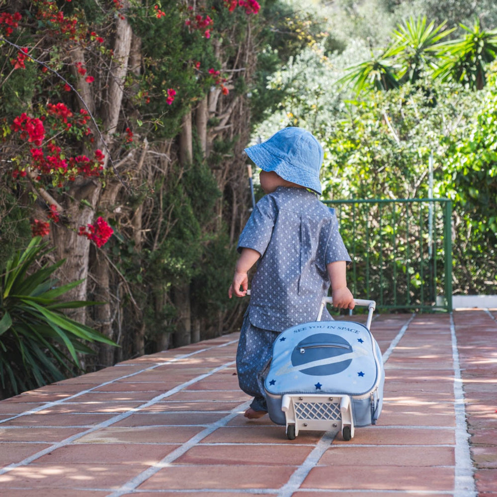 Introducing the That's Mine Blue Tris Trolley Bag, an ideal travel companion for your little adventurers that's as functional as it is fun. Designed with children's unique needs in mind, this suitcase combines safety, comfort, and whimsical style into one. Carefully crafted to ensure it's easy for children to use, the trolley features durable wheels and a lightweight build, allowing your child to maneuver it effortlessly through airports, stations, and more.