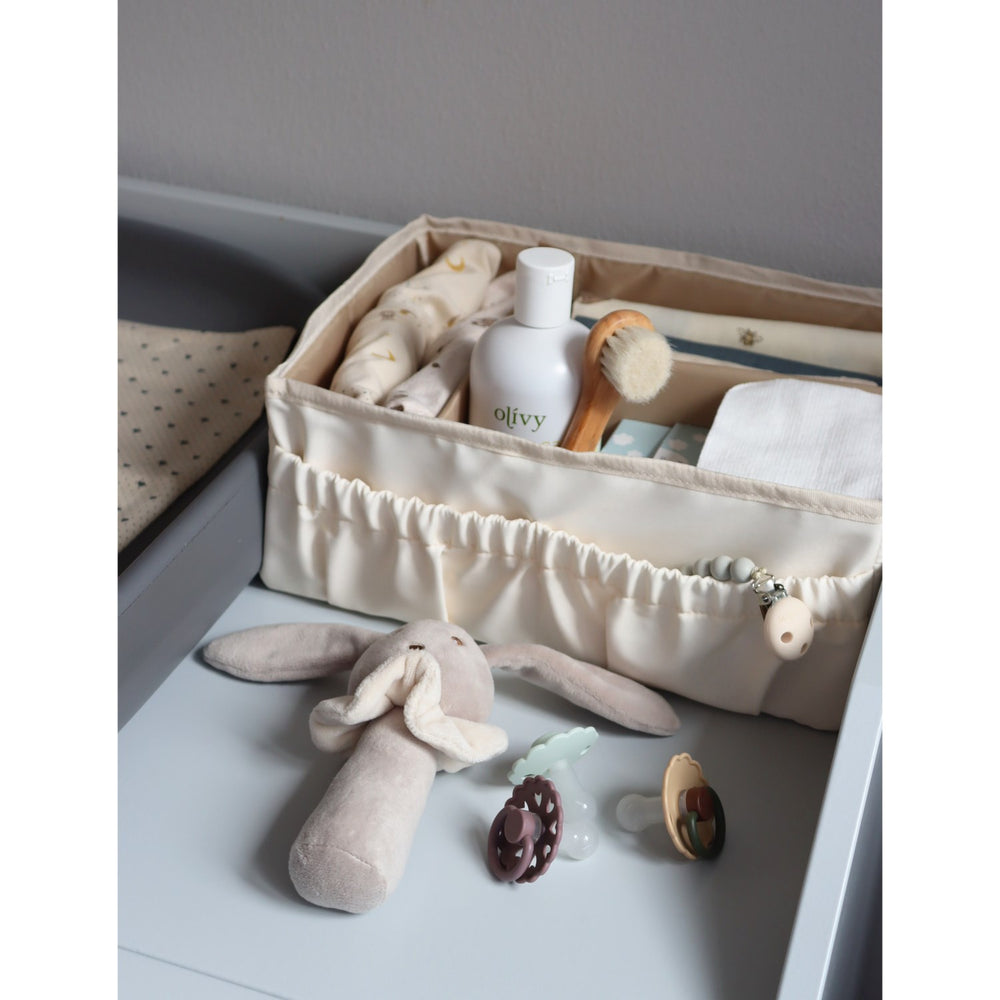Discover the convenience of the That's Mine Light Creme Lily Nursing Organizer, designed to simplify your nursery needs. This storage box is ideal for keeping diapers, creams, and other essentials neatly organized with one large versatile compartment, featuring removable dividers and a practical Velcro closure for customizable storage. It includes additional pockets, one large and two small, to ensure everything has its place. When not in use, the box can easily be folded up to save space, making it as functional as it is stylish. Perfect for busy parents, this organizer combines functionality with a sleek design to enhance your nursery's aesthetics while promoting efficiency during changing times. Materials: 100% Recycled polyester Materials and care: Do not wash, Do not iron, Do not tumble dry, Do not dry clean, Do not bleach Measurements: Product height (cm) 13, Product length (cm) 32, Product width (cm) 22 Washing instructions: Wipe with damp cloth