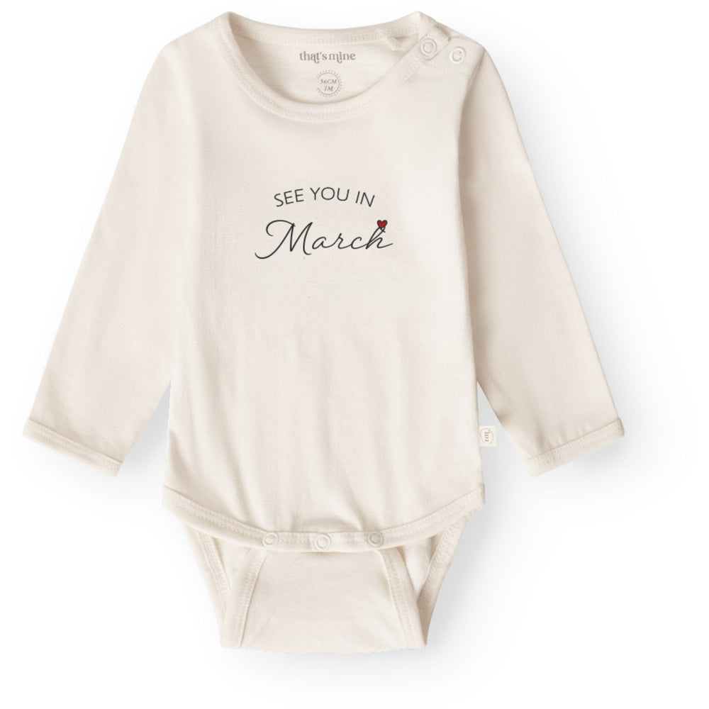 Introducing the enchanting "See You In March Obi Bodystocking," a delightful choice for sharing your joyful announcement. Crafted with care, this baby bodysuit features a charming design ideal for revealing your little one's expected arrival to grandparents and loved ones. The soft, comfortable material ensures a gentle touch on delicate skin, while the whimsical font adds a playful twist. Easy to wear and care for, it's perfect for making unforgettable memories. Prepare for smiles and excitement as you celebrate together! Materials: 100% Organic cotton Washing instructions: 40 degrees, Do not iron, Tumble dry on low heat, Do not dry clean