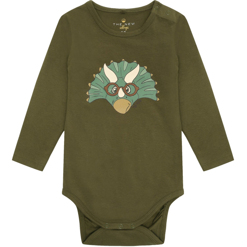 This long-sleeved bodysuit features a whimsical front print of a bespectacled dinosaur, adding a touch of playful charm. The design is complemented by a classic round neckline and a practical snap button closure at the crotch and on one shoulder, making dressing and diaper changes easier for parents.