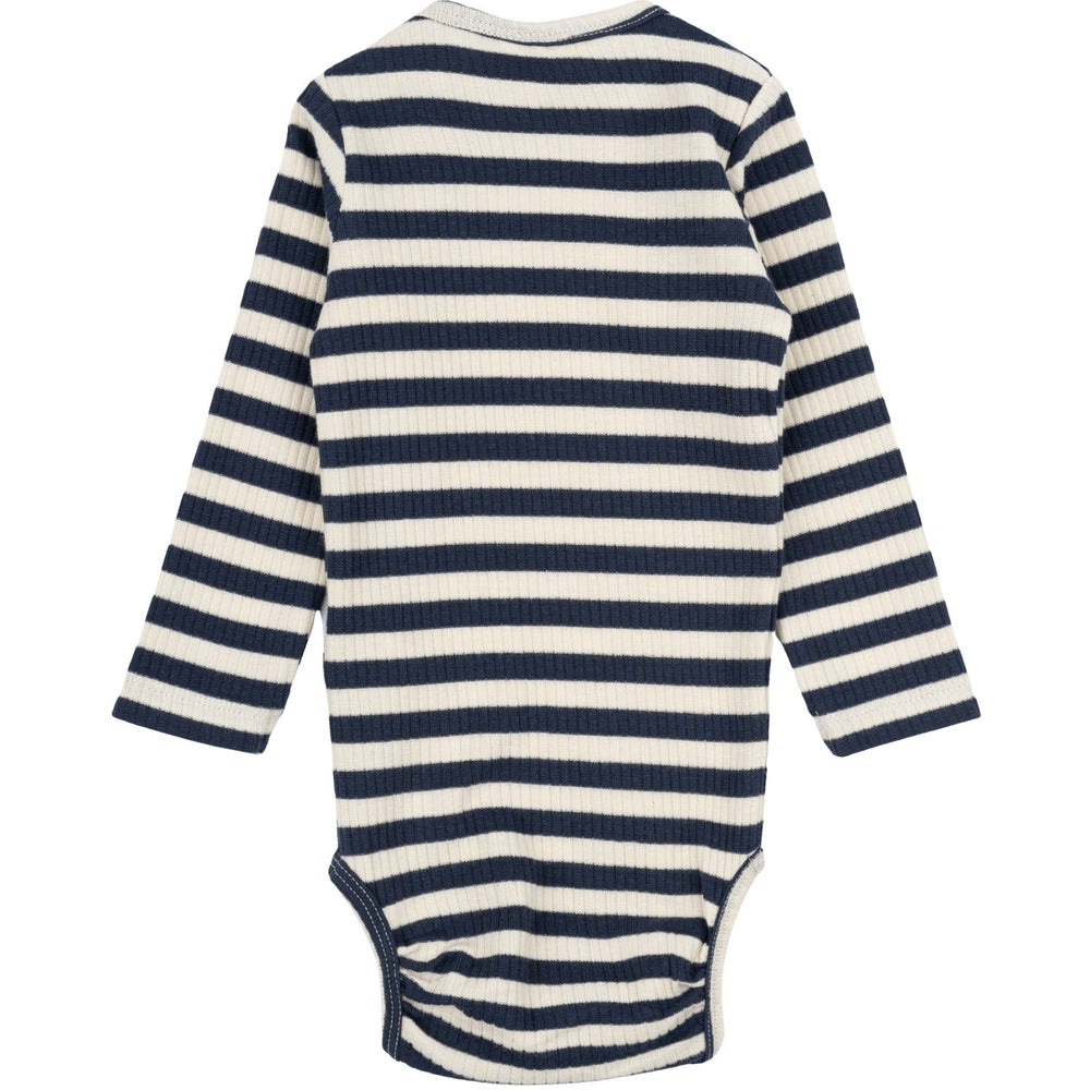 Introducing THE NEW Siblings Mood Indigo Striped Fro Uni Rib Body, perfect for your little one's comfort and style. Crafted from soft, stretchable rib fabric, this charming bodysuit features a captivating striped pattern in indigo. Its design ensures a snug fit, enhancing movement freedom, while the durable material promises easy care. Ideal for both playtime and rest, this piece combines functionality with a touch of elegance.