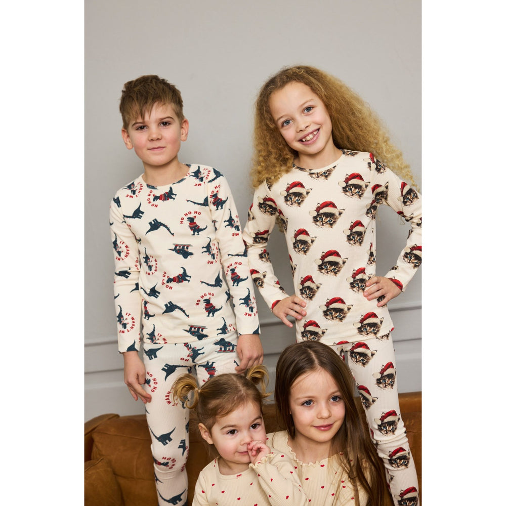 Ensure your little ones are snuggled warmly this festive season with The New Gardenia Cat AOP Holiday Rib Night Set. Crafted from GOTS Organic ribbed fabric, this set pairs a cozy long-sleeved blouse with matching leggings, promising a comfortably snug fit. It features delightful prints, either adorable Santa-hat-clad cats or cheerful dinosaurs in a Christmas setting, sure to spark joy. Available in regular fit sizes, these night sets are ideal for long winter nights or cheerful, relaxed holiday mornings. They make a charming gift and can even be coordinated with adult sizes for fun family matching moments during the holiday celebrations. Ideal for keeping children comfortable and festive all season long!