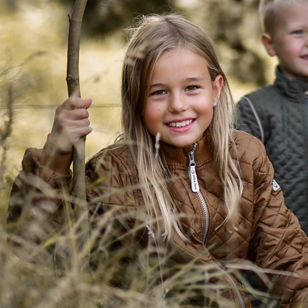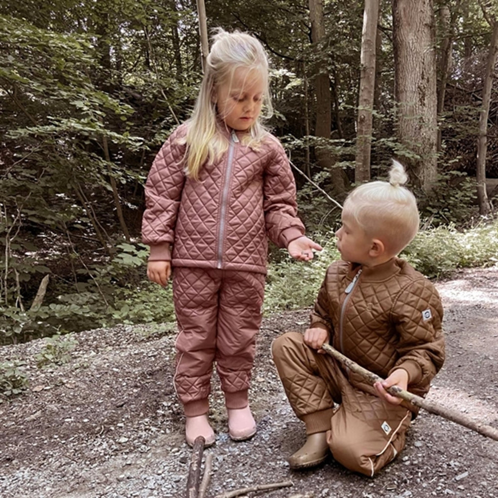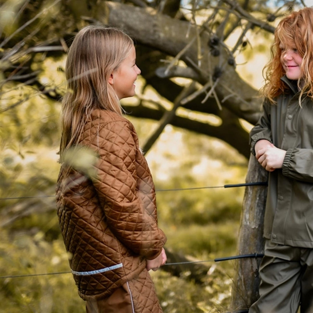 Delicious thermo set for the active kids. This in a most beautiful brown color. On the trousers there is reinforcement on the knees and on the buttocks. In addition, there are reflectors on the legs and back of the back, and holes for the thumbs in the sleeve ribs. In addition, the thermal clothing is water-repellent, so it is perfect during the transition period.