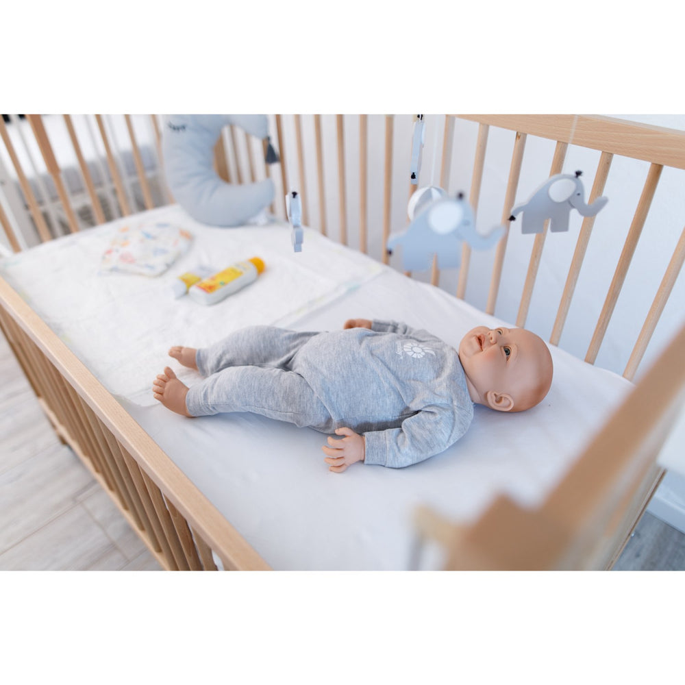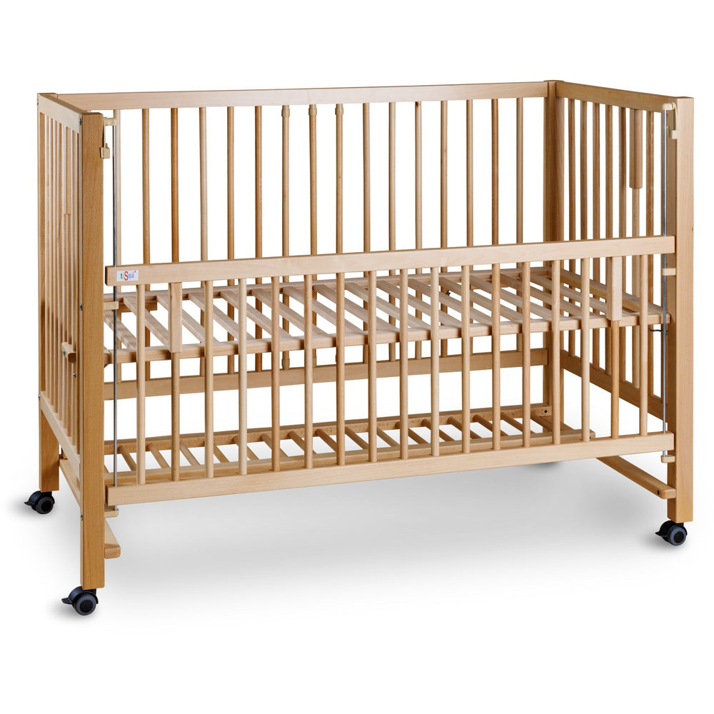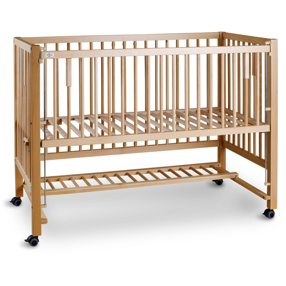 Materials: Solid beech natural lacquer Measurements: 120 x 95 x 60 cm Washing instructions: The tiSsi® cot HAJO should only be wiped with a damp cloth and then rubbed with a dry cloth. The colors of the tiSsi® may change due to too much sunlight Certifications: Organic, environmentally friendly and sustainably produced An all-rounder Thus functions as an extra bed, baby cot, nursing bed and cot 3 bars on the side can be removed, so the child can crawl out on their own when the child reaches that age Ideal from newborn to about 6 years The bed base can be adjusted in height: 38/58 to 78 cm NOTE: Mattress is NOT included