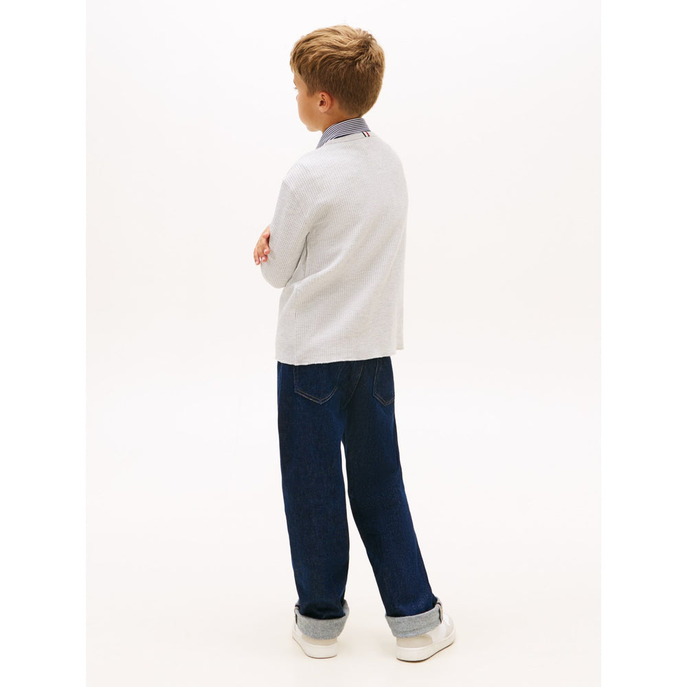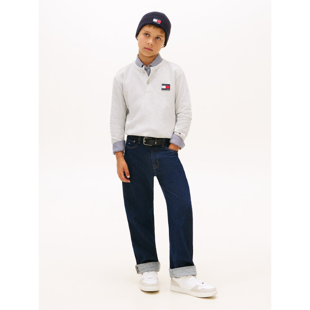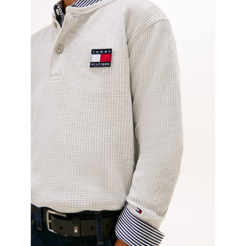 Introducing the Tommy Hilfiger Mid Grey Heather Heritage Henley Waffle Tee LS, a perfect addition to your child's wardrobe. Crafted from cozy waffle-knit fabric, this classic Henley-style tee in a mid-grey heather shade features a stylish design with the trusted Tommy Hilfiger brand quality. Its long sleeves and snug fit offer comfort and warmth, ideal for cooler days. Easy to care for, this garment promises durability and fuss-free maintenance, making it not only chic but also practical for everyday use.