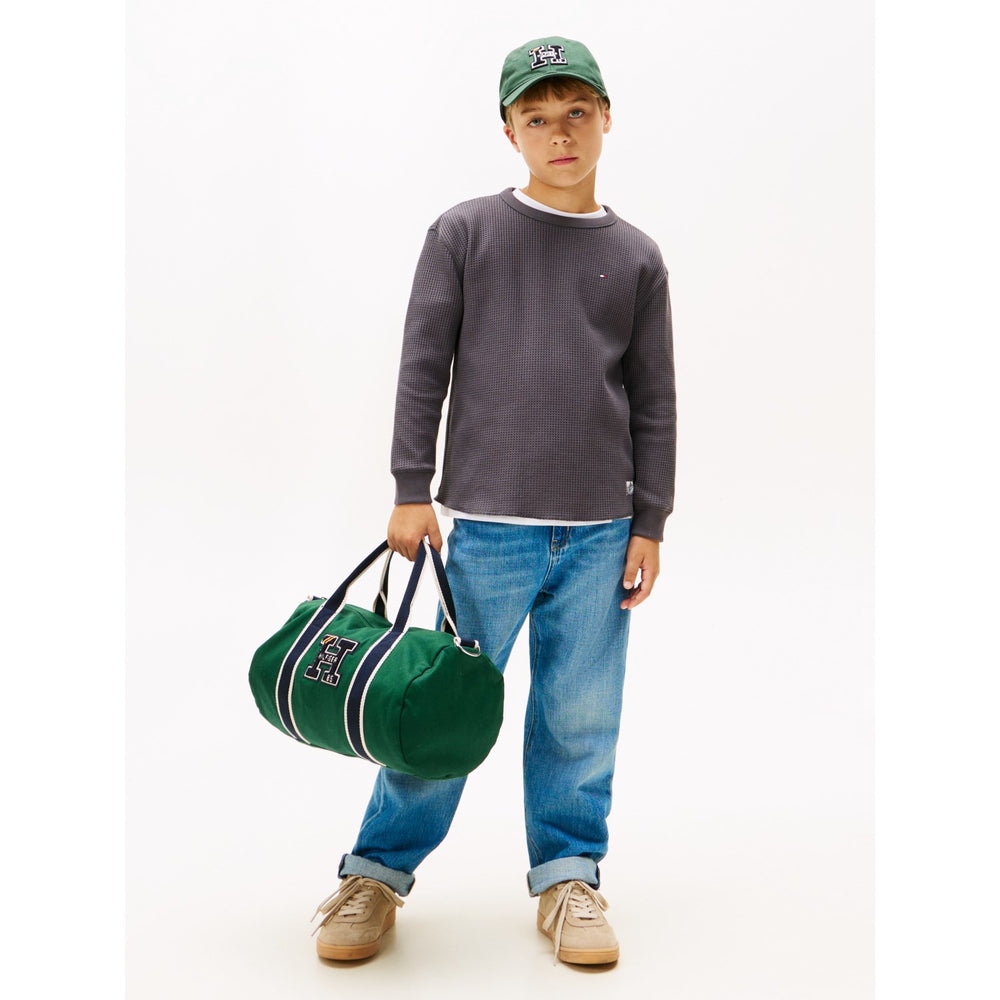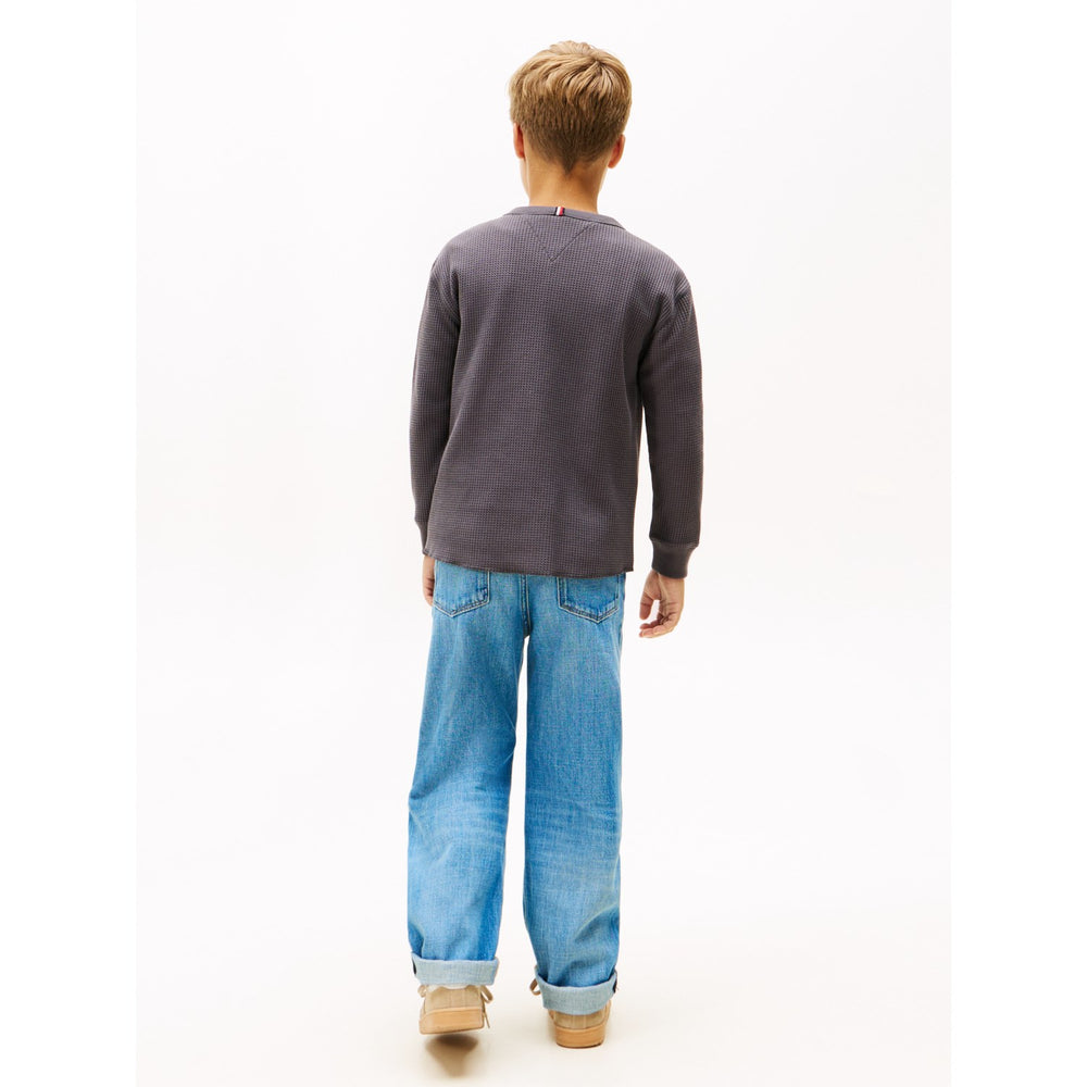 Introducing the Tommy Hilfiger Washed Black Textured Waffle Tee, a must-have for your child's wardrobe. Crafted from a cozy, textured waffle-knit fabric, this long-sleeved tee offers both warmth and breathability, making it perfect for transitioning through seasons. Its classic washed black shade and subtle yet stylish pattern enhance its versatility and ease of pairing with other pieces. Designed to fit comfortably, this shirt guarantees all-day wearability without compromising on style. Easy to care for and durable, it promises to maintain its appeal through frequent washes. Ideal for both casual outings and relaxed days at home, this tee from a trusted brand like Tommy Hilfiger not only adds style but also comfort to your child's daily attire.