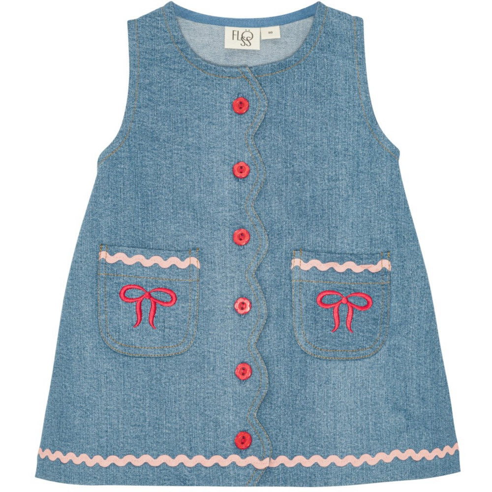 Introducing the delightful Flöss Mid Blue Rinse Hazel Dress, perfect for your little one's wardrobe. Crafted from light woven 100% cotton denim, this dress features a charming round neck and adorable front pockets adorned with bow embroidery. The stylish wave placket and vibrant red buttons add a pop of fun, while pink contrast details on the pockets and hem enhance its visual appeal. Ideal for layering, the Hazel Dress pairs beautifully with a woven blouse, offering versatility and style. Easy to care for, this piece combines comfort with durability, making it an essential addition to any child's collection.