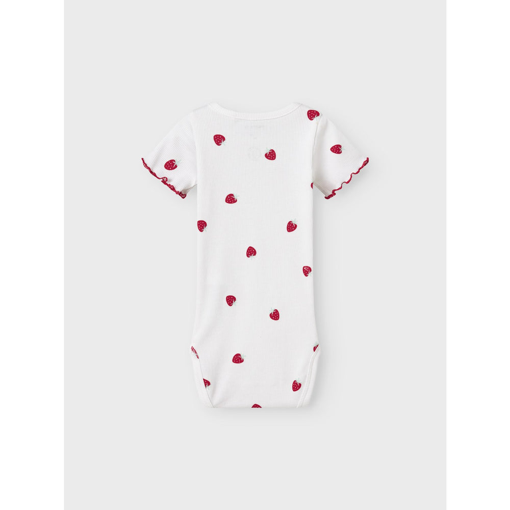 Introducing the Name It Bright White Jillie Body, a bodysuit designed with your child's comfort and style in mind. Crafted from rib knit, this garment offers excellent elasticity and a soft feel, ideal for everyday wear. It features an eye-catching striped pattern and a bright white hue adorned with a charming repeating print. The round neck and short sleeves with frilled cuffs add a dash of elegance, while the press stud fastening ensures easy dressing. Available in various sizes, this bodysuit fits perfectly, promising both comfort and durability. Please note: Keep this item away from fire to ensure your child's safety. Perfect for all seasons, this stylish bodysuit is a must-have in your little one's wardrobe.