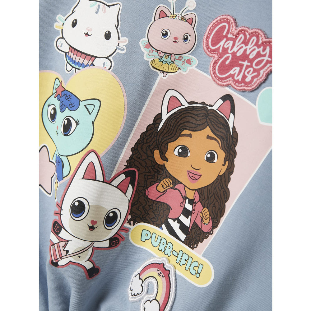 Introduce a splash of fun and coziness to your little one's closet with the "Name It Dusty Blue Nmfjyla Gabby Sweat Unb Sky". This enchanting sweatshirt, inspired by the whimsical world of Gabby's Dollhouse, combines style with comfort. Crafted from unbrushed sweat fabric, it features a smooth exterior and soft loops inside, ensuring your child stays comfortable throughout the day. The delightful rubber print of Gabby and her magical cat ears adds a touch of charm and is gentle to the touch.