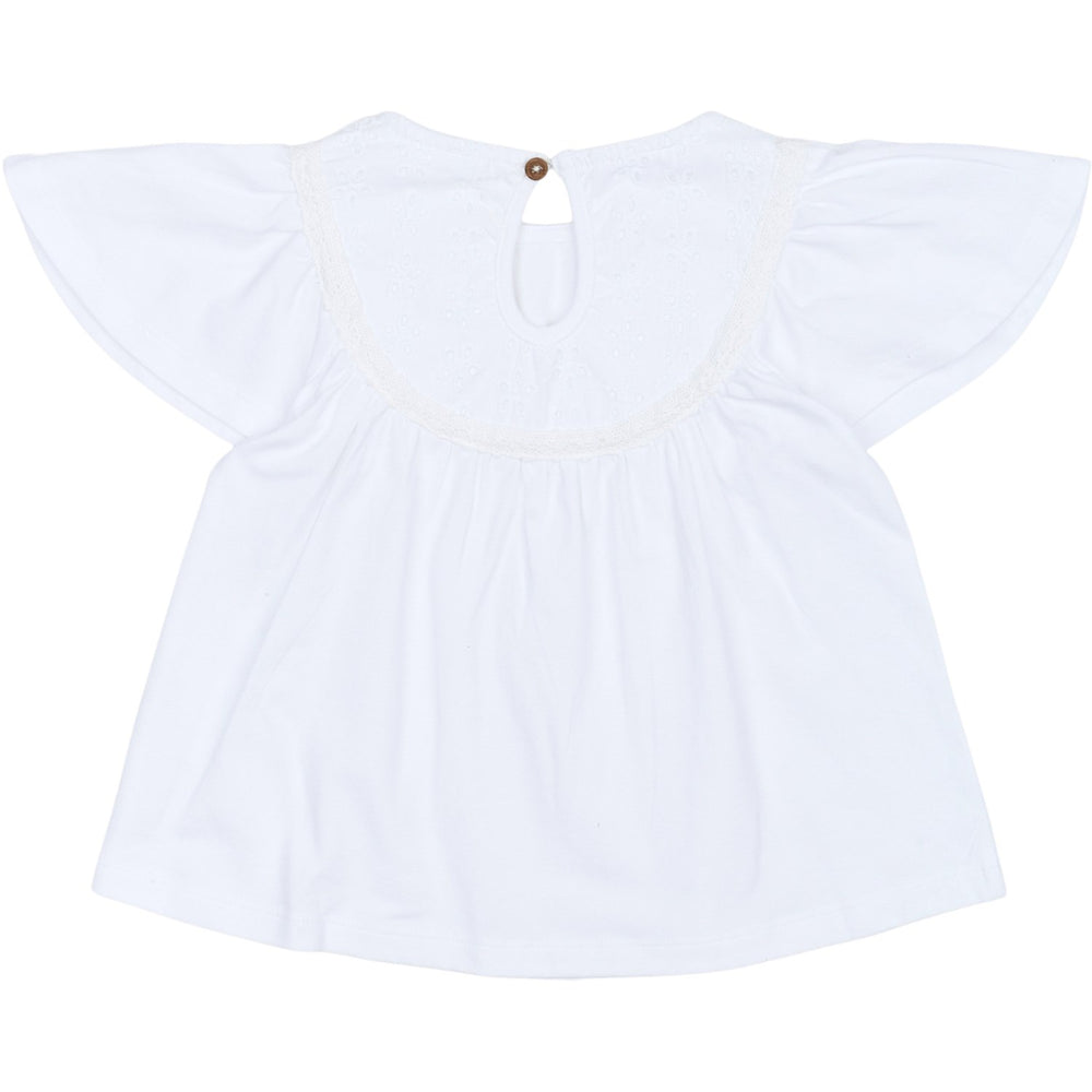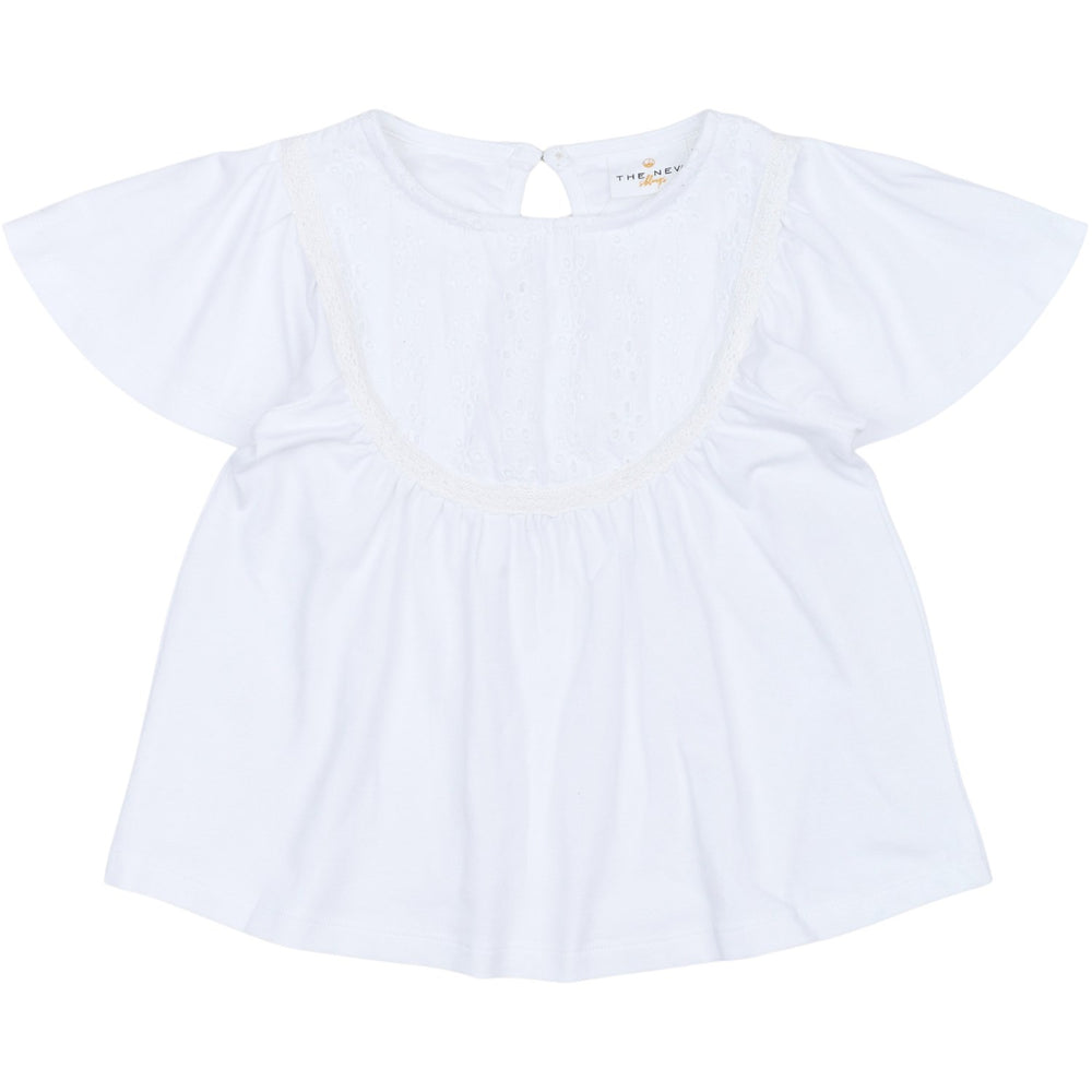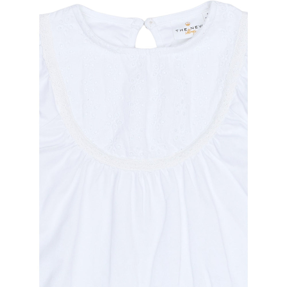 Dress your little one in the charming Siblings White Swan Novalie Top by THE NEW. Featuring delicate lace details and a classic round neckline, this versatile short-sleeved blouse is ideal for both festive occasions and everyday wear. Crafted for comfort with a regular fit and easy button closure at the back, it promises both style and ease for any child's wardrobe. Perfect for pairing with various bottoms, this top escalates any outfit effortlessly.
