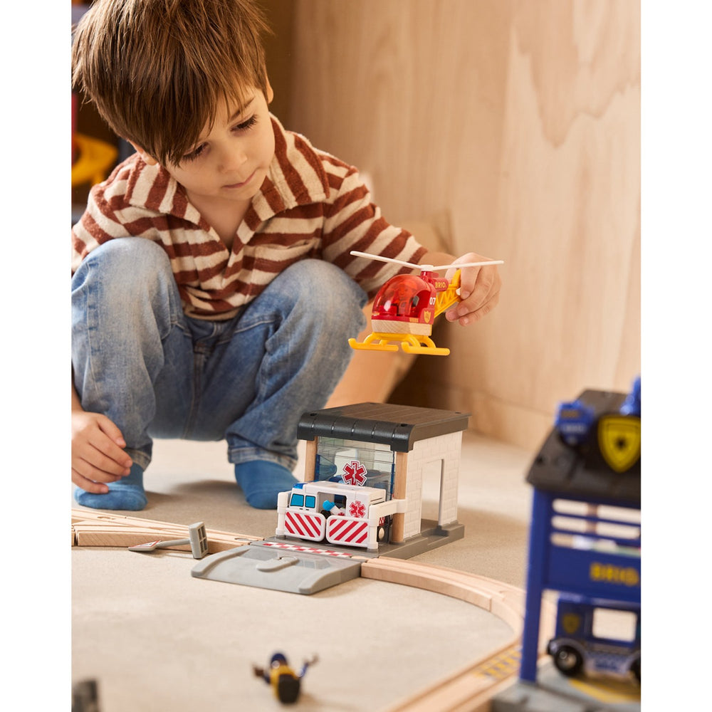 Embark on a thrilling rescue adventure with the BRIO® 36025 Rescue Team Train Set! Designed to ignite young imaginations, this set allows children to role-play as heroic firefighters, police officers, and paramedics. The set includes a fire train with a helicopter, a police motorcycle, and a feature-packed ambulance that lights up and sounds just like the real thing. Crafted from high-quality plastic and European FSC-certified beech wood, this set ensures durability and safety for children aged 3 and up. Its engaging and interactive elements promote fine motor skills and teach about emergency services in a fun, memorable way. Whether played with alone or integrated with other BRIO World train sets, it promises hours of educational fun, making cleanup, storage, and maintenance a breeze. Unleash a world of creativity and learning with this exceptional train set!