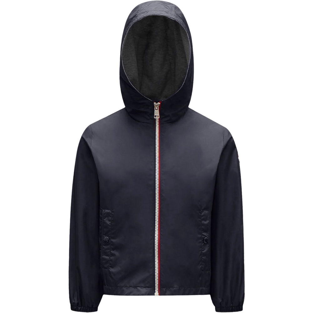 Discover the stylish Moncler Navy New Urville jacket, made for the adventurous child. This durable jacket is made from recycled nylon that ensures optimal protection from light rain, while the soft cotton jersey lining offers comfort. Designed with a practical hood and a secure zipper closure, this jacket is both functional and fashionable. The tri-colour details at the zipper add a breath of fresh air to the classic design, and the elastic cuffs and seams guarantee a perfect fit that will last for the child's many activities. In addition, there are smart front pockets with snap closures and a distinctive felt logo patch that completes the look with a touch of elegance.