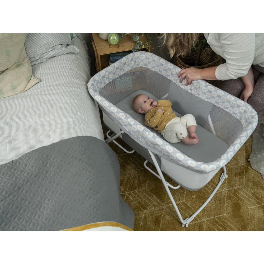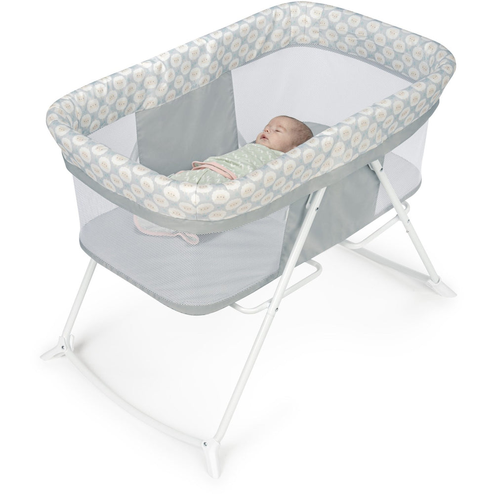 Discover the joy and convenience of the Ingenuity Grey "Soothe & Stow" Crib, perfect for nurturing your infant's dreams anywhere you go. This travel cot combines exceptional safety with the utmost comfort, featuring a robust frame and breathable mesh sides that ensure your baby is safe and well-ventilated throughout their rest. Approved for newborns up to babies weighing 7kg, it meets stringent safety and quality standards. Simplicity meets versatility with this cradle’s dual functionality; soothe your infant with the gentle rocking motion, or switch to a stationary position for a peaceful sleep setting. The ease of assembly and foldable design makes it perfect for both home use and travel, providing a familiar sleeping environment for your baby wherever you are. Maintenance is straightforward, thanks to the detachable, washable fabric adorned with a charming sheep pattern in a soothing grey hue, ensuring that it’s not only functional but also visually appealing. When it’s time to pack up, the cradle stows away effortlessly, making it an ideal choice for efficient storage and transport. Enhance your baby's comfort and stimulation with the Ingenuity Soothe & Stow, designed to keep your little one cozy, secure, and engaged in their early moments and beyond.