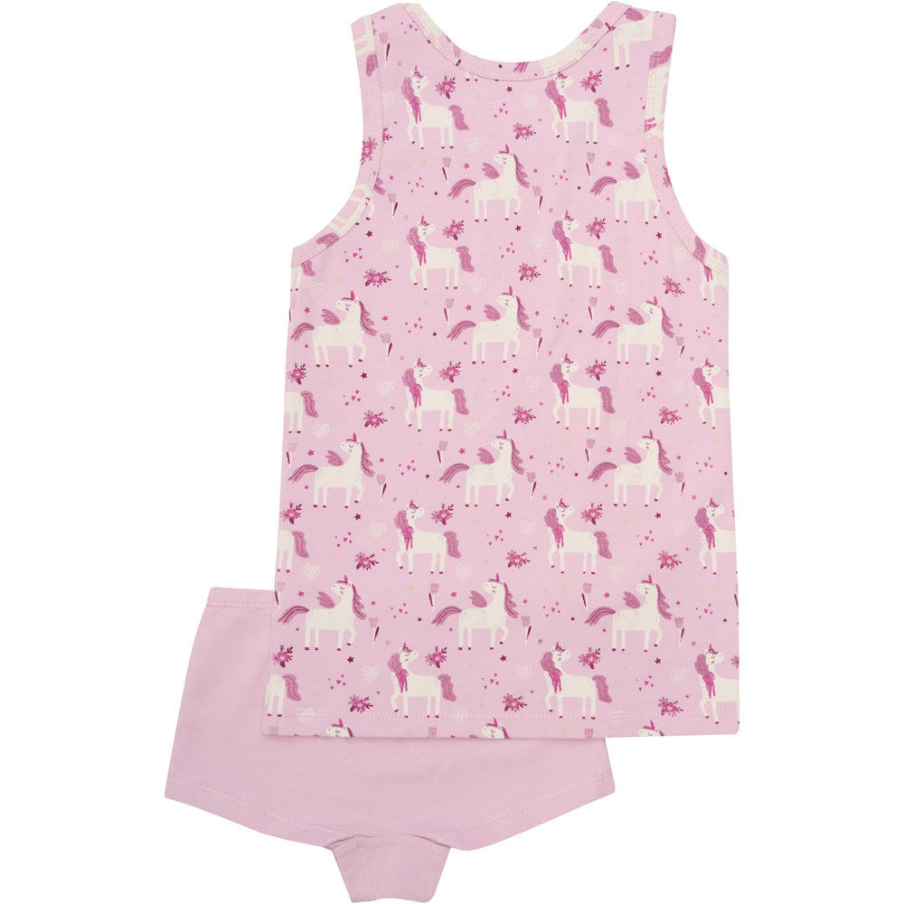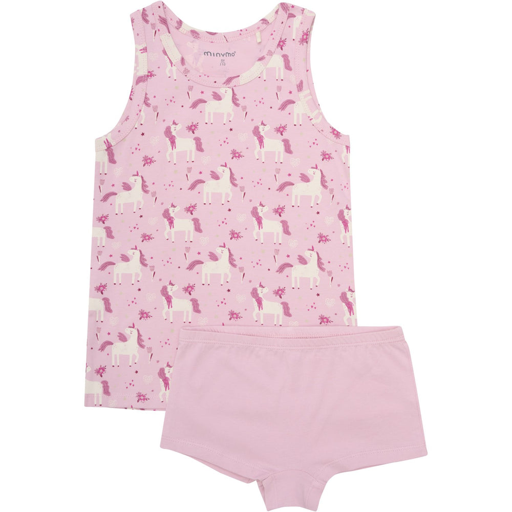 Dress your little one in comfort and style with the Minymo Bleached Mauve Underwear Set. Featuring a charming unicorn print on the undershirt with wide straps, paired with solid-colored underpants, this set combines whimsy and practicality. It's crafted from certified organic materials (GOTS - organic CERES-0366), ensuring softness against sensitive skin while upholding eco-friendly standards. Perfect for everyday wear, this delightful set supports a comfortable fit and easy care, making it an ideal choice for your child's wardrobe.