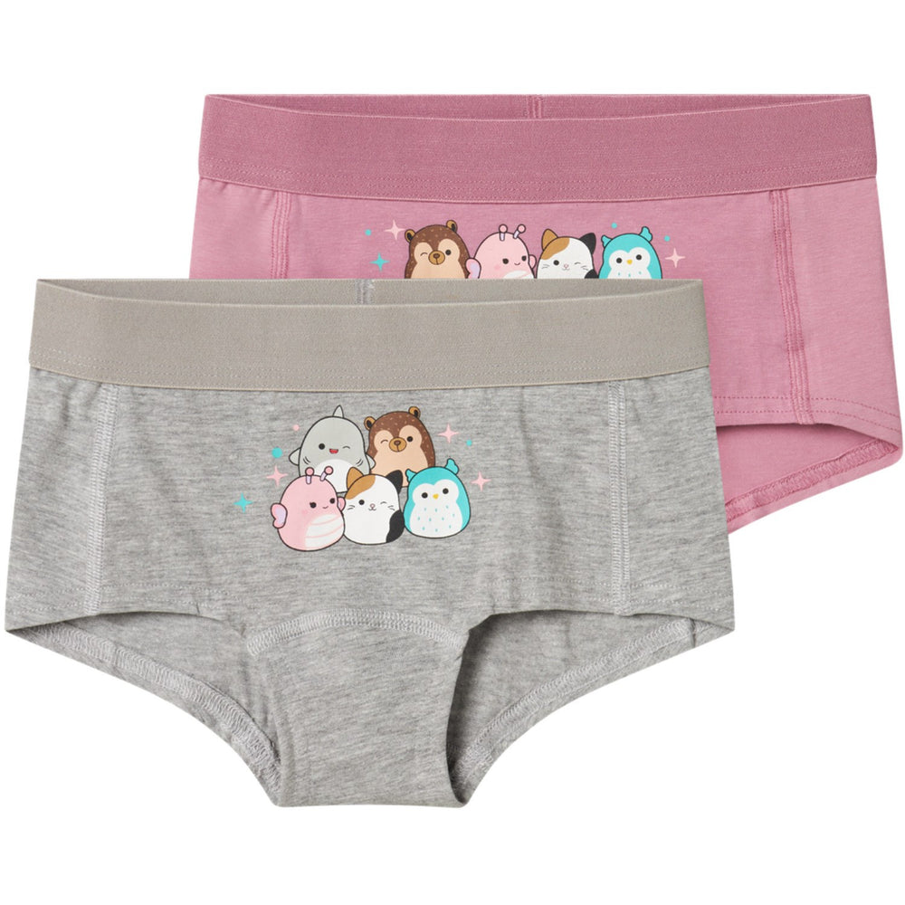 Discover the charm and comfort of the Name It Grey Melange Odessa Squishmallows 2-pack Hipsters, the perfect addition to your child's wardrobe. Crafted from soft jersey material, these hipsters combine lightweight and stretchy fabric with a plush interior, ensuring maximum comfort and the freedom for your child to move easily. Featuring a delightful rubber print of the popular Squishmallows, these undergarments are not only stylish in their grey melange color but are also exceptionally soft to the touch due to their unique print technique.