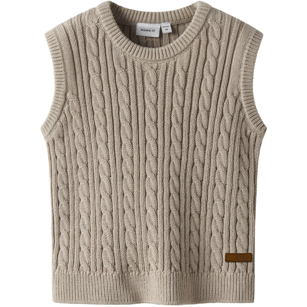 Introduce your little one to the cozy charm of the Name It Island Fossil Nmmroman Knit Slipover. Crafted from soft cable knit, this sleeveless vest combines comfort and style with its snug round neck and regular fit. Adorned with a ribbed hem and a sleek label detail, it's easy to care for and perfect for layering. Ideal for adding a touch of trendiness to any outfit, this vest ensures your child looks great and feels comfortable all day long.