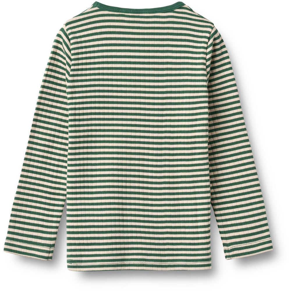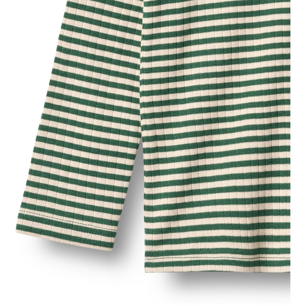 Discover the charm of our Wheat Green Stripe Blouse Stig, a delightful addition to any junior wardrobe. Crafted from 100% organic cotton, this long-sleeved rib T-shirt ensures a soft and tactile experience with its eco-friendly, GOTS-certified material. Featuring a regular fit and a timeless ribbed structure adorned with classic stripes, it promises both style and comfort.