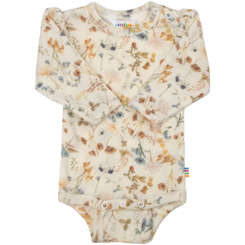 Wrap your little one in cozy comfort with the Joha Off White Body featuring long sleeves. Crafted from pure merino wool, this bodysuit is exceptionally soft and gently stretches for a perfect fit. It's adorned with a beautiful digital autumn flower print, adding a touch of elegance. Convenient snap buttons on one shoulder and between the legs ensure easy dressing and quick changes. Oeko-tex 100 certified, it's safe and gentle on your child's skin. Ideal for both play and rest.