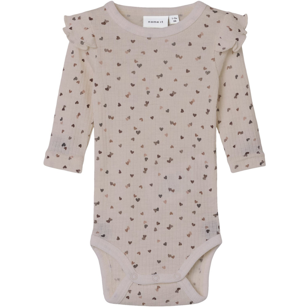 Introduce your little one to the comfort and charm of the Name It Shadow Gray Dots Nbfwomi Wo/Mo Ls Body. Crafted from a blend of Merino wool and modal, this bodysuit ensures warmth while allowing skin to breathe, maintaining a comfortable body temperature. Featuring an all-over dot print, long sleeves, and delightful ruffle details, it combines functionality with style. The round neck and convenient press stud fastening at the crotch enhance wearability. This bodysuit is perfect for both snuggly bedtime and active playtimes, ensuring your child looks adorable and feels comfy throughout the day.