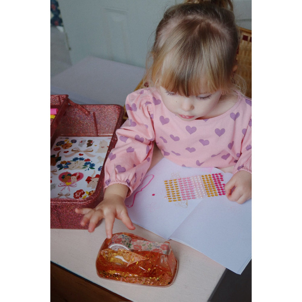 Bring a dash of sparkle to your child's creative projects with the Konges Sløjd Red Sparkle Splash Tape Dispenser. Designed with both fun and functionality in mind, this vibrant tape dispenser not only adds a splash of color to art sessions but is also crafted to be child-friendly, ensuring safe usage for little hands. Its compact size and ease of use make it perfect for children to manage their drawing and crafting materials efficiently, promoting both organization and creative independence. Easily portable, it fits snugly into any crafting corner or can be quickly stored away. Ideal for kids who love to express themselves creatively, this tape dispenser is an essential tool that enhances their artistic explorations while ensuring safety and educational engagement. Materials: Shell: Acrylic, Inside: Water, Mix Mineral Oil, Glitter, PET, Tape, Paper
