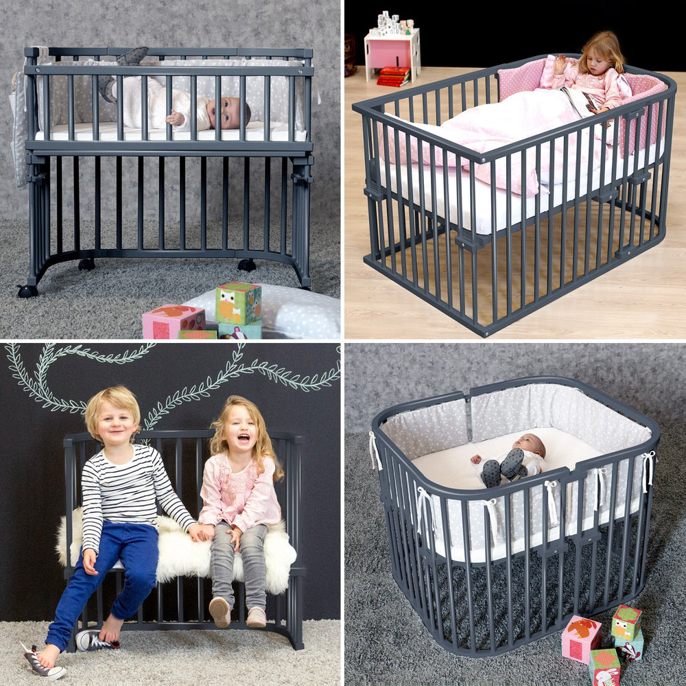 Discover the babybay® Grey Varnished Boxspring Co-Sleeper, the ultimate companion for high beds, especially designed with style and safety in mind. Boasting a cutting-edge design with patented, infinitely variable height adjustment, this co-sleeper promises a seamless transition to your family bed, ensuring your little one is snug and secure with no gaps or steps. The excellent ventilation of its lying surface paired with our custom-fit mattresses guarantees optimal air circulation, promoting a safe, soothing sleep environment.