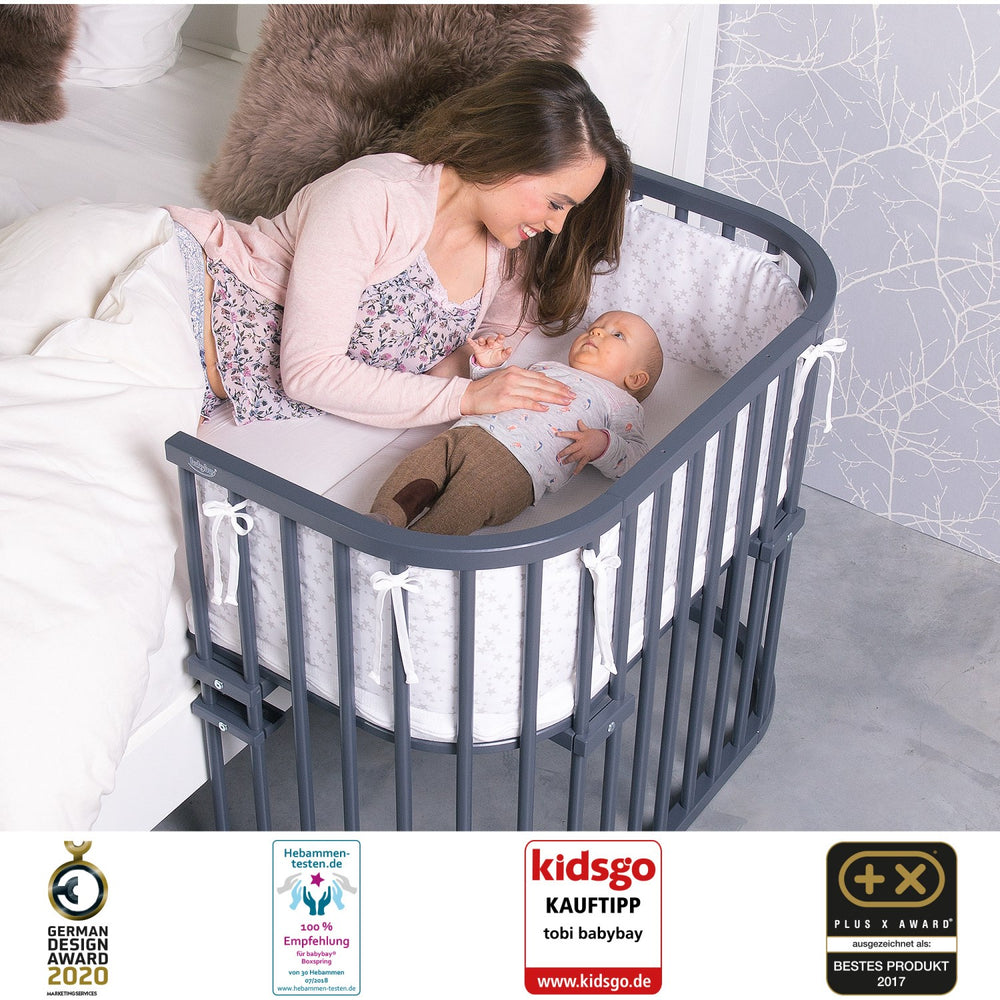 The babybay® doesn’t just promise a peaceful night's sleep but also boasts exceptional functionality and versatility. Attach it securely and effortlessly to your bed with adjustable fastening brackets, transforming the co-sleeper into various child-friendly furniture such as a desk or play table as your child grows. This adaptability is complemented by a chic, saliva-resistant grey varnish finish on sustainably sourced, solid beech wood, ensuring durability and environmental responsibility.