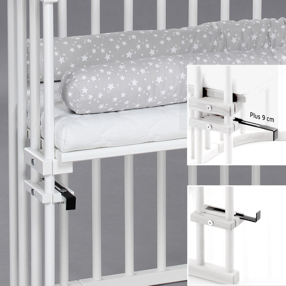 Thanks to its unique, patented design, the Babybay® offers an infinitely adjustable height, ensuring a flush fit against any adult bed without leaving gaps or creating steps. Safety is paramount; thus, it features adjustable fastening brackets that securely attach the co-sleeper to the parents' bed without any need for tools, wobbling, or instability. The system is complemented by excellent ventilation and TÜV-tested construction, employing saliva-resistant and non-toxic varnishes compliant with DIN EN 71 part 3 standards.