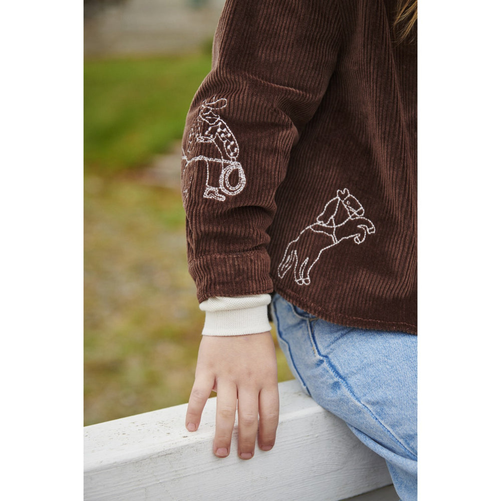 Discover the charm of our Copenhagen Colors Dk Brown Comb Corduroy Overshirt! Crafted in 100% lush velvet, this shirt features a classic collar and button-down front for easy dressing. Adorned with unique embroidery, including a sheriff on the left sleeve, a sheriff star on the right chest pocket, and a playful horse at the bottom, it is perfect for young adventurers. Its rich brown color and comfortable fit make it ideal for both everyday wear and special occasions. Easy to care for, it ensures your child stays stylish without compromising on comfort.