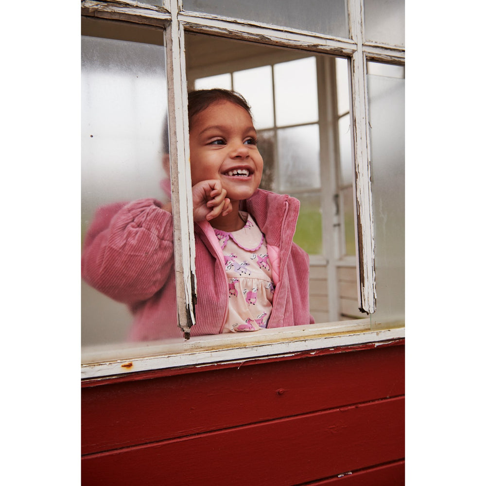 Keep your little one cozy and stylish with the Copenhagen Colors Rose Comb. Corduroy Bomber Jacket, designed with the elegance of long sleeves and a smooth round neckline. This jacket is crafted from 100% premium corduroy, ensuring durability and comfort. Inside, it charms with a whimsical unicorn-patterned lining, perfect for capturing the imagination of children. Its versatile rose hue complements various outfits, making it a superb choice for transitioning between seasons. Easy to care for, this jacket combines functionality with a dash of enchantment, becoming an essential piece for any child's wardrobe.