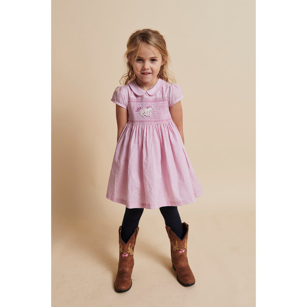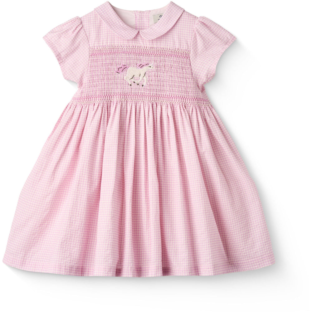 COPENHAGEN COLORS Syringa Comb. Houndstooth Dress W. Handmade Unicorn Embroidery And Smock - 86 is backordered and will ship as soon as it is back in stock.