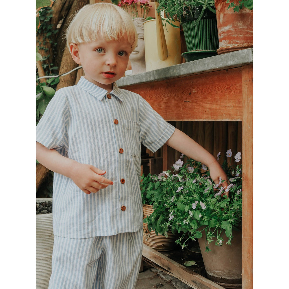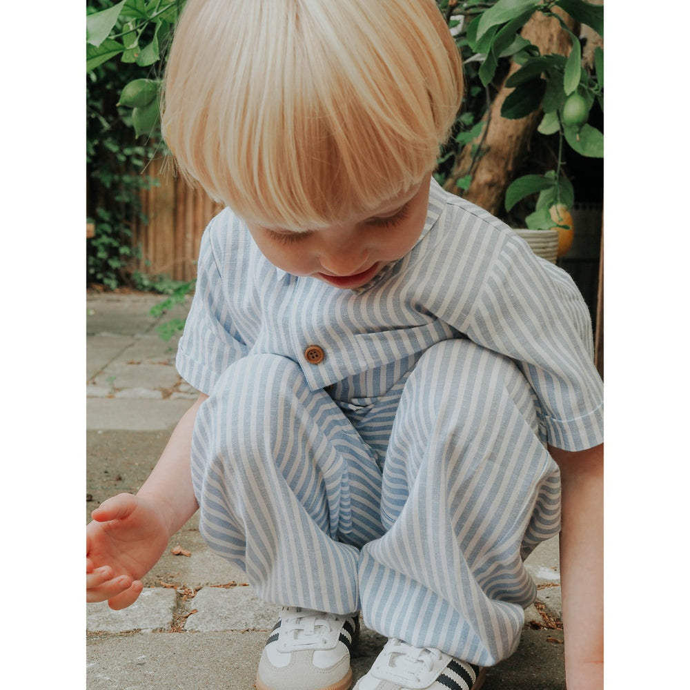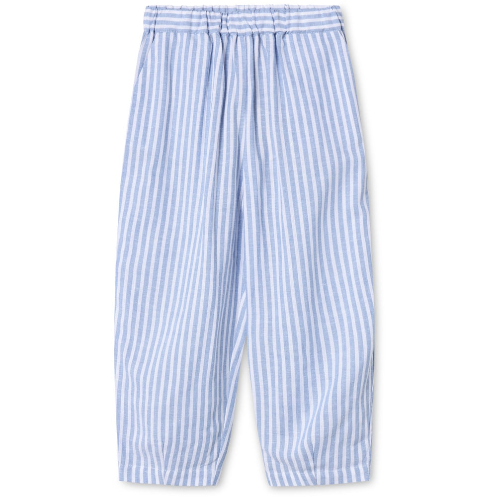 Dive into comfort with our Fliink Dream Blue/Cloud Dancer Vira Pants! Perfect for adventure and play, these pants come with a relaxed fit and jazzy side pockets, all tied together with a snug elastic waistband. Crafted from a soft, breathable linen-viscose blend, they boast a playful stripe design in dreamy sand tones. These versatile pants pair splendidly with our coordinating blouse or shirt for a complete stylish ensemble.