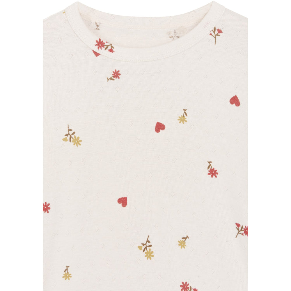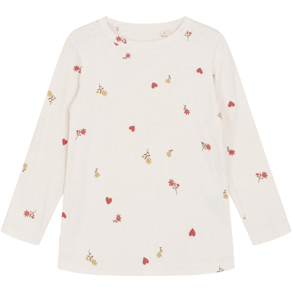 Discover the charming Hust & Claire White Sand Austin blouse, perfect for your child's everyday wardrobe. This long-sleeved t-shirt is made from an incredibly soft and stretchy bamboo viscose that ensures a comfortable fit for active kids. The blouse's delicate print with hearts and flowers and the elegant lace pattern add a sweet and stylish touch, while the round neckline makes it easy to put on and take off.