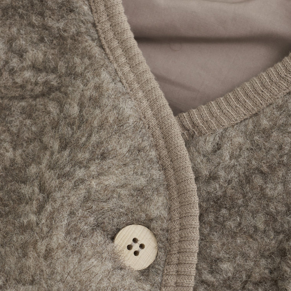 Brighten up your little one's wardrobe with the delightful HUTTEliHUT Camel Melange Vest! Crafted from 100% Merino wool, this vest showcases a plush Teddy texture coupled with a snug lining, ensuring maximum warmth and comfort. Its stylish v-neck and charming button front make it perfect for both playful days and cozy evenings. Adorned in a soft camel color, it fits effortlessly with any outfit. Practical and easy to care for, simply wash using gentle wool detergent and lay flat to dry. This vest, ideal for adding a layer of warmth, promises to keep your child comfortable and chic all season long.