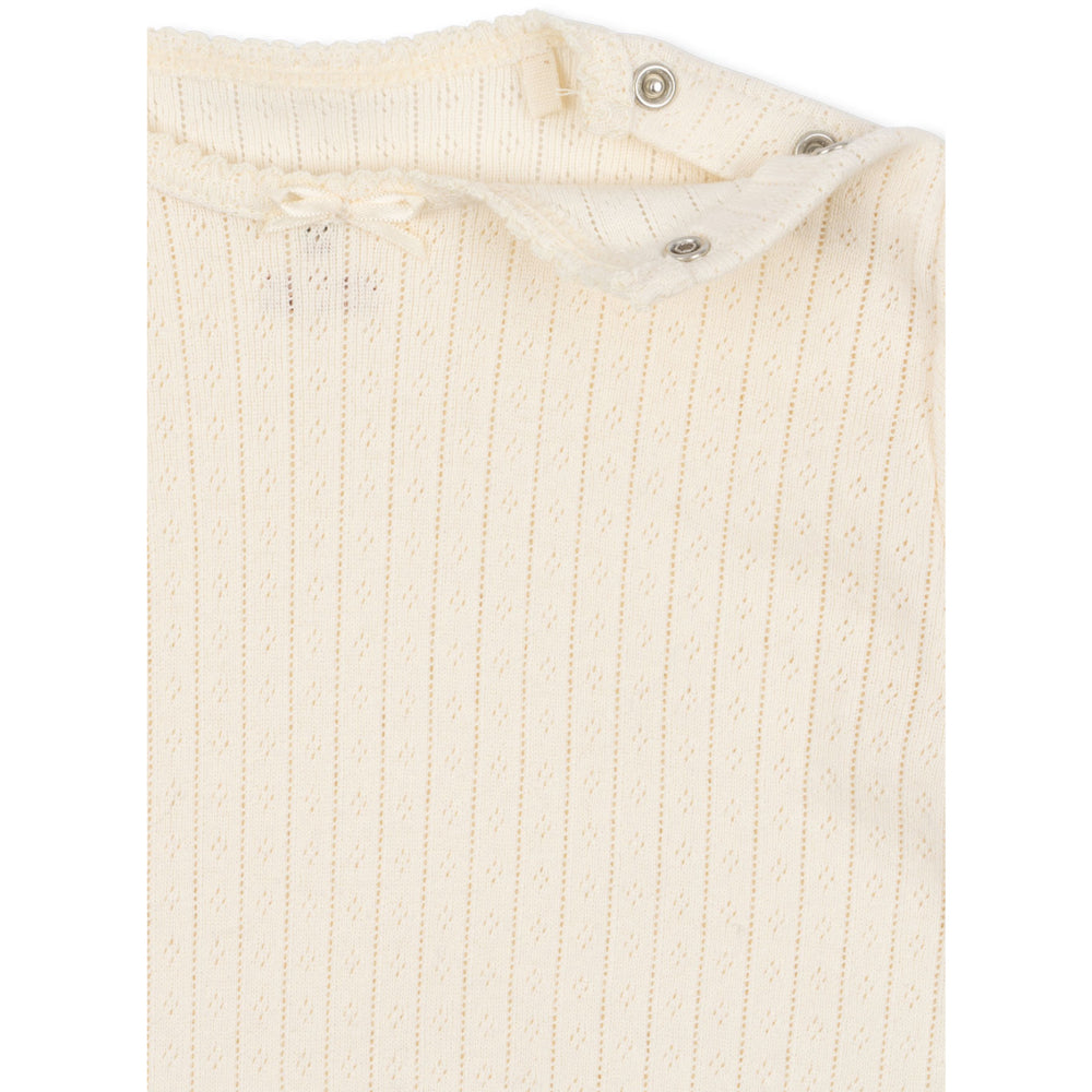 Introducing the Konges Sløjd Buttercream Minnie Body Gots, a charming addition to your little one's wardrobe. Crafted from soft, GOTS-certified cotton, featuring a delicate pointelle design for a touch of elegance. This bodysuit boasts practical snap buttons at the crotch, ensuring hassle-free dressing and changing. Ideal for everyday comfort with a flair of style, it's a must-have for your child’s comfort and convenience. Materials: 100% Organic Cotton Certifications: GOTS ORGANIC