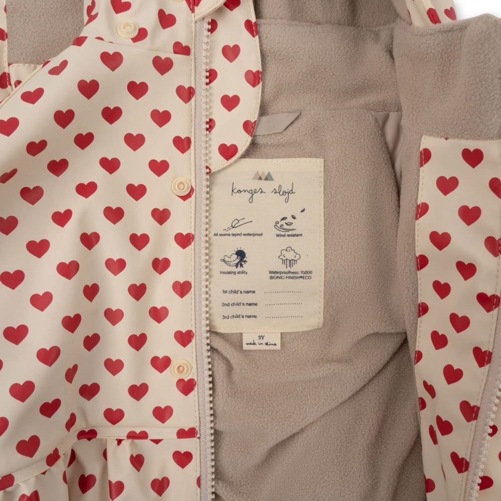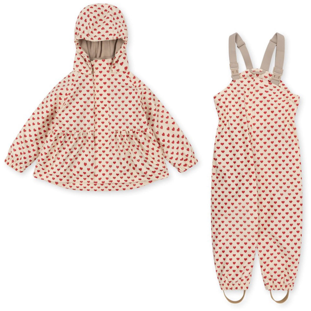 Introduce your little one to the joys of puddle-jumping with the Konges Sløjd Coeur Rouge Rainy Palme Set. Crafted from wind-resistant and waterproof PU, this charming rainwear set is perfect for any weather. It includes a cozy, lined, detachable hood and elastic cuffs that ensure a snug fit, while welded seams offer ultimate protection against the elements. Adorned with a playful pattern, the set is not only functional but stylish, making it an ideal choice for your girl's outdoor adventures. Easy to care for and wonderfully durable, it's designed to keep your child dry and comfortable no matter how wet it gets outside.