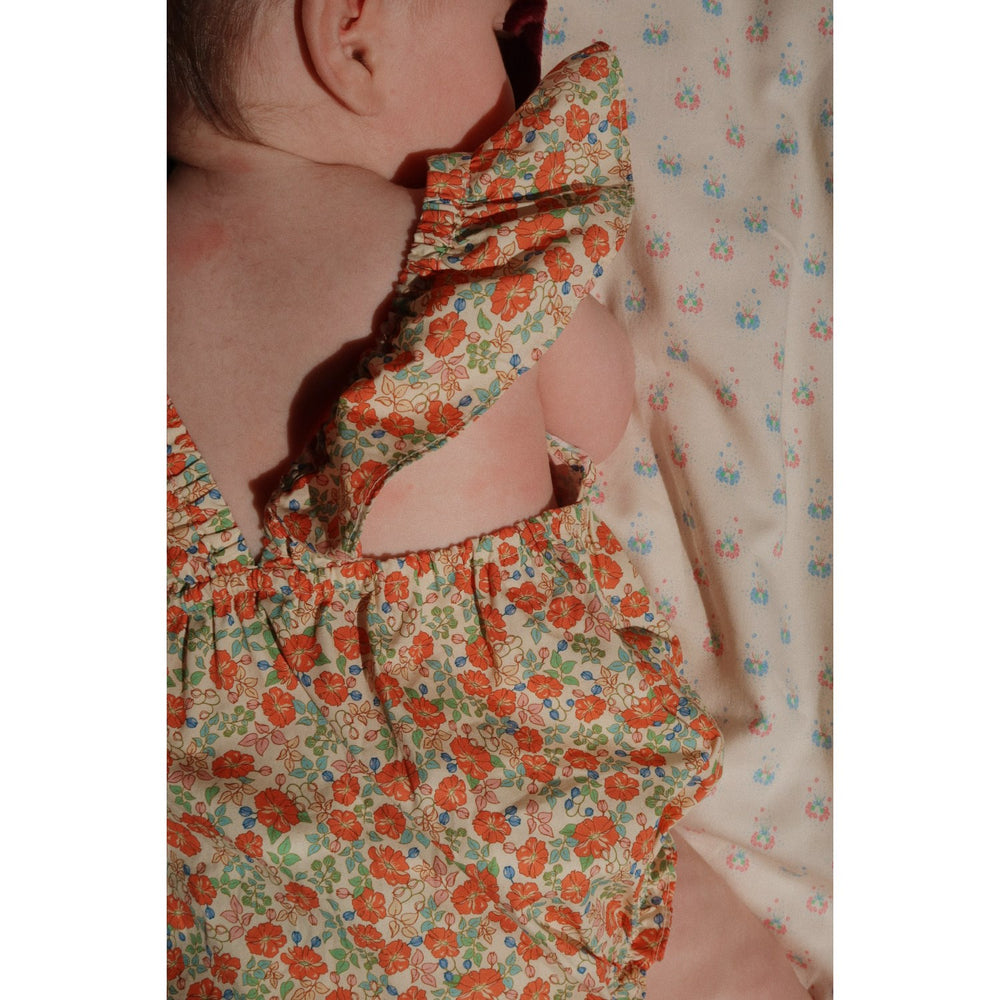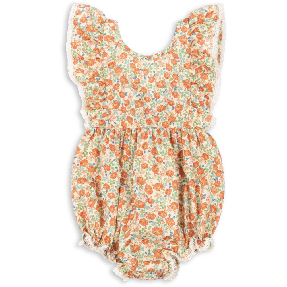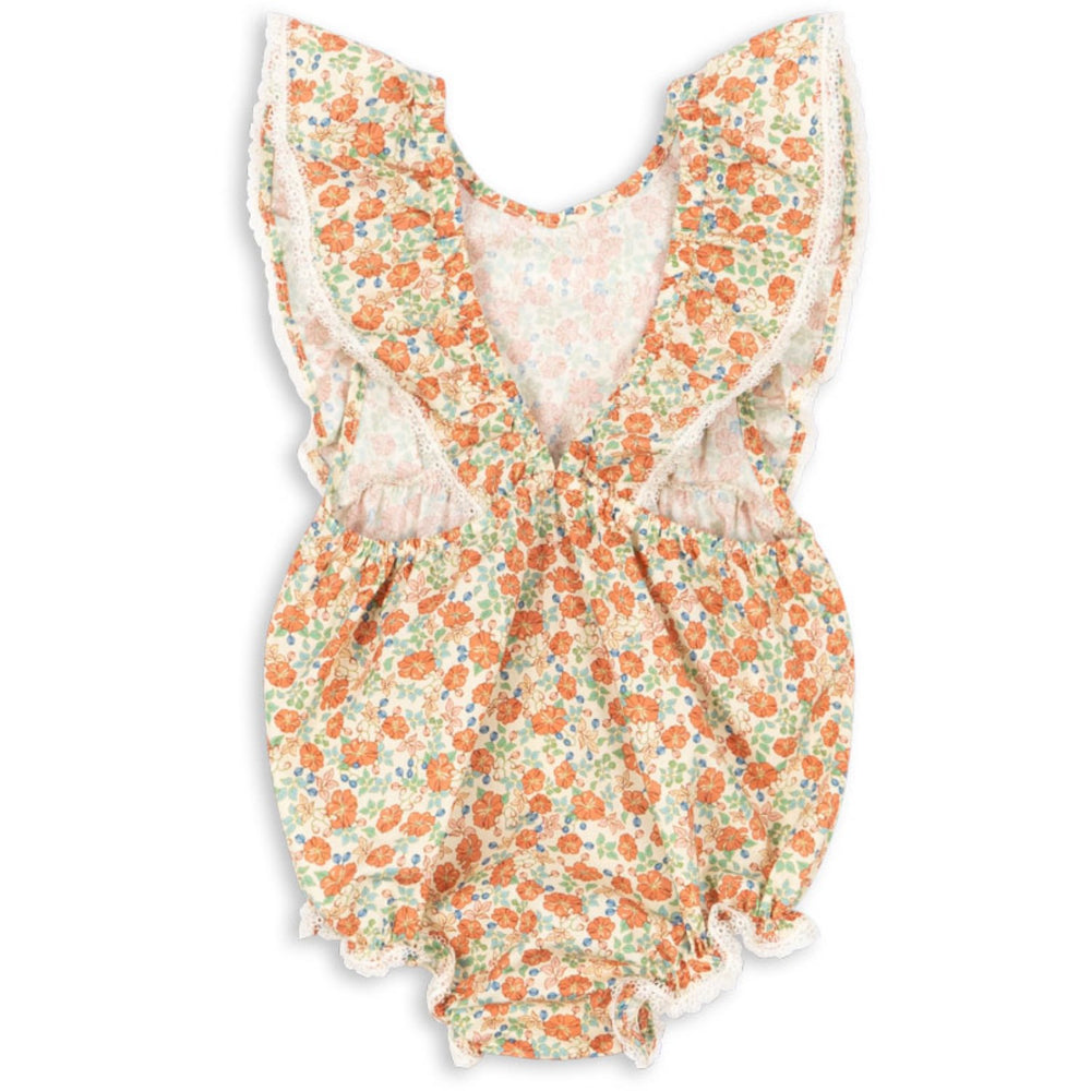 Discover the charm of the Konges Sløjd Kaluka Verbena Romper, perfect for your little one's comfort and style. Made from 100% organic cotton with GOTS certification (CU1094701), this romper boasts playful frill straps and a unique V-back design. The handy press buttons at the leg openings ensure easy dressing for ages 1 month to 3 years. Its delightful pattern and robust construction offer durability, making it an ideal choice for both daily wear and special occasions.