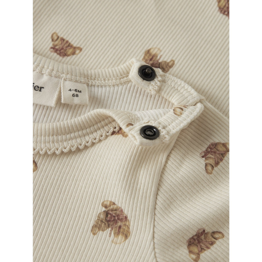 Dress your little one in the stylish and cozy Lil'Atelier Turtledove Croissant Nbflavo Egi Ls Slim Body. Crafted from jersey, this lightweight bodysuit offers a soft touch on both the surface and the inside, securing comfort and freedom of movement for your child. It features a classic round neck and long sleeves, ensuring warmth and coverage. The bodysuit is adorned with a charming, uniform print and is designed with practical press stud fastening at the bottom and shoulder for easy dressing. Ideal for everyday wear, this piece combines trendy looks with functional comfort. Note: Keep away from fire.